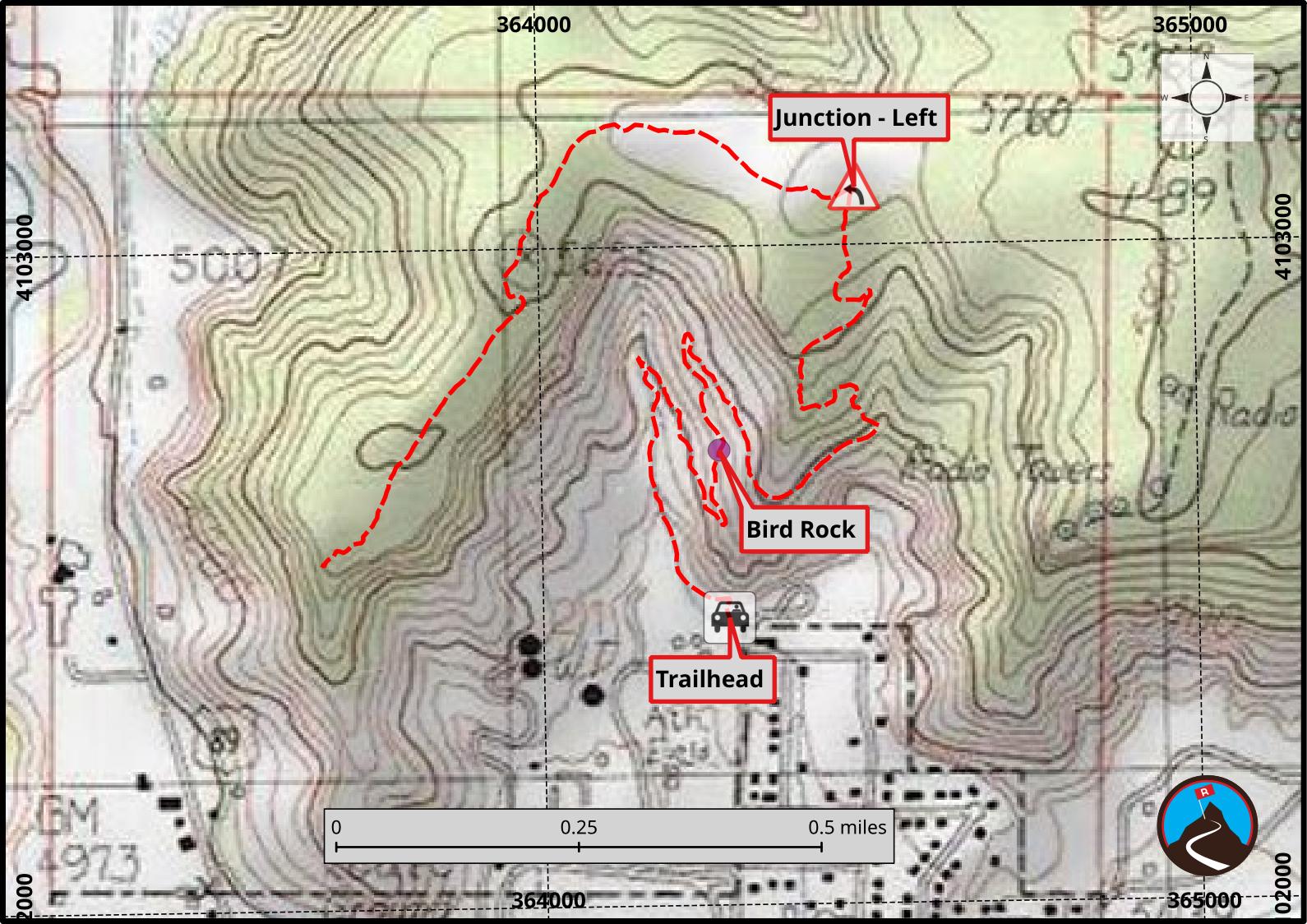 From the trailhead, the goal is to head up the trail at the bottom of the canyon ahead and to the left of the trailhead. The trail system has numerous branches here. In general, we stayed on the trail signed Raven Trail to reach the canyon bottom, then up the canyon bottom. The trail is well-used and easy to follow.