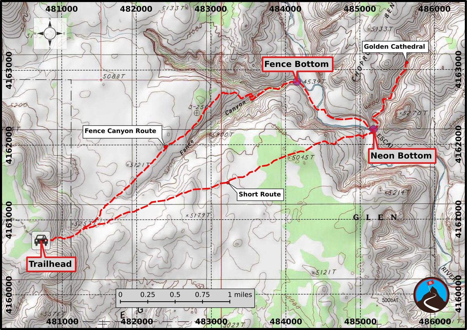 There are two approaches to the Golden Cathedral, both start at Egypt Bench. The first approach, down Fence Canyon, is the most common and on a well-cairned trail. Camping near the river at Fence Canyon is excellent and recommended. The second approach is cross country directly to the river near Neon. This is less scenic and requires a bit more route finding, but is shorter. If doing this as a day hike, cross country is probably the ticket.