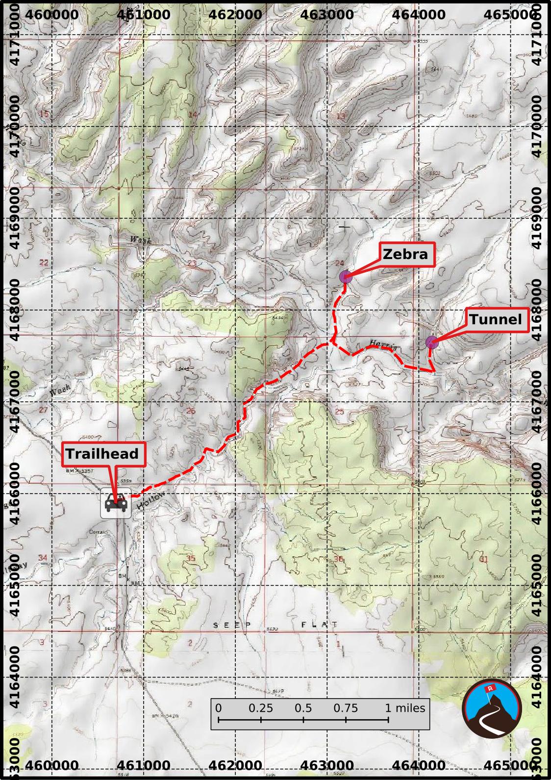 From the trailhead, cross the road and find a well-traveled hikers path on the north side of the road near the cattle guard. Follow this north while it meanders its way down to Halfway Hollow. The trail is well defined and well cairned. It will take 40-50 minutes to reach the bottom of Halfway Hollow. Near the bottom, the trail cuts left over low meanders and heads directly for Zebra. Follow it, crossing Harris Wash, and heading for the first obvious side canyon.