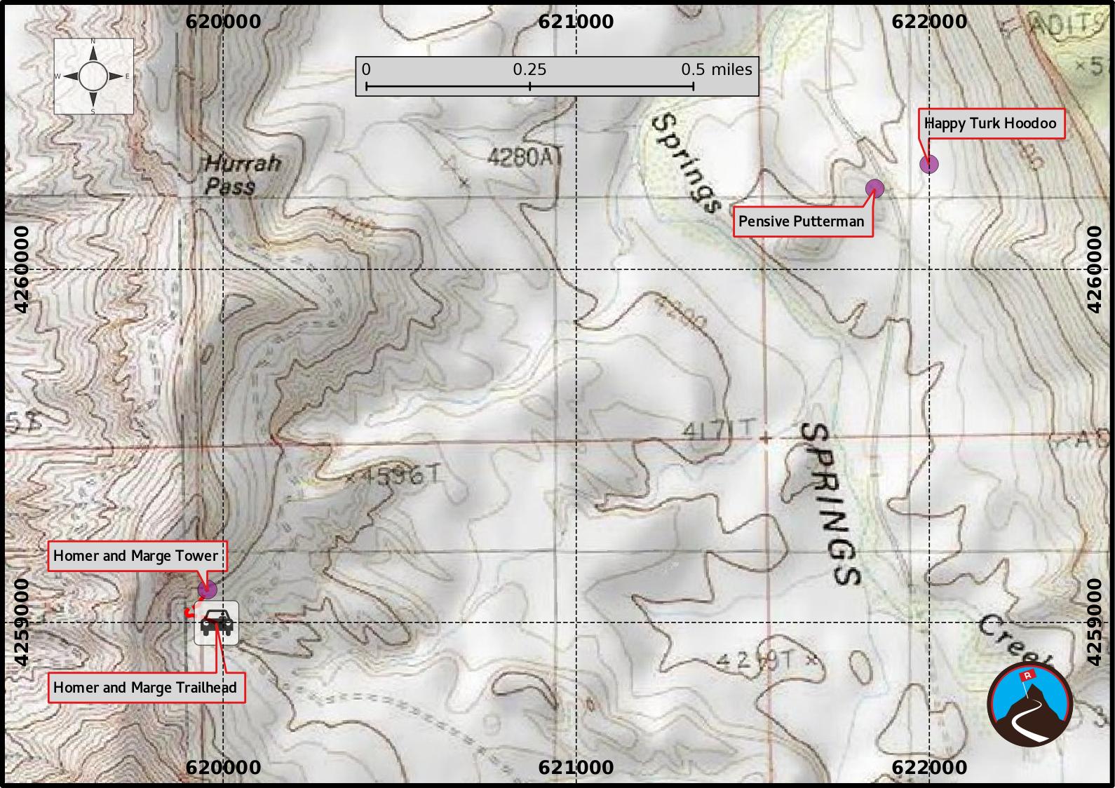 From the parking spot, find an easy way up the first cliff band on the west, and follow the cliff band as it parallels the road. One up the cliff band, you will see Homer and Marge to the north west shortly. With good route finding, it is an easy hike to its base. The route is on the north west side.