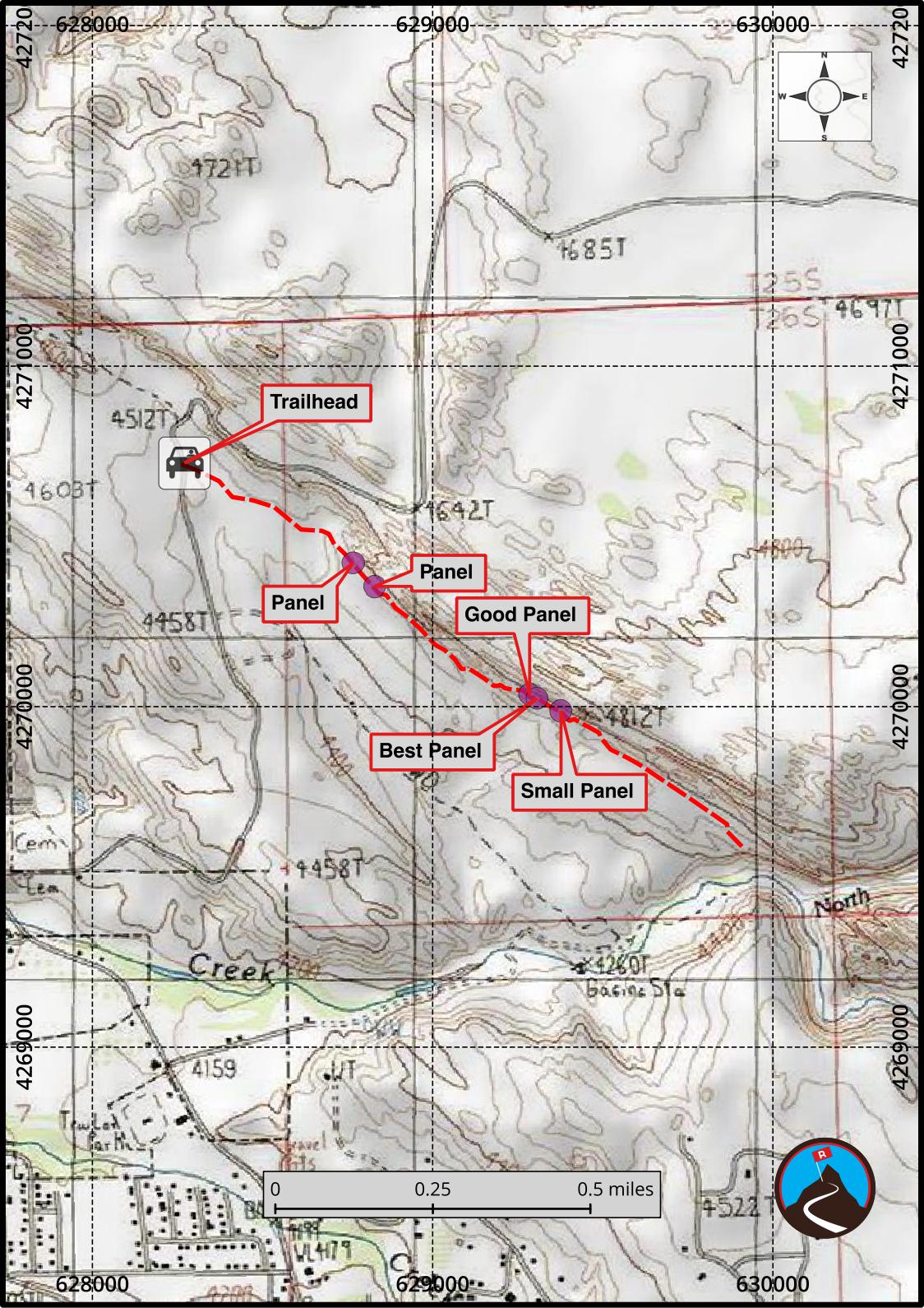 Continuing south from the good panels along the cliff band, an overlook of Mill Creek marks the end of the hike, return the way you came along the cliff, or follow the old road back.
