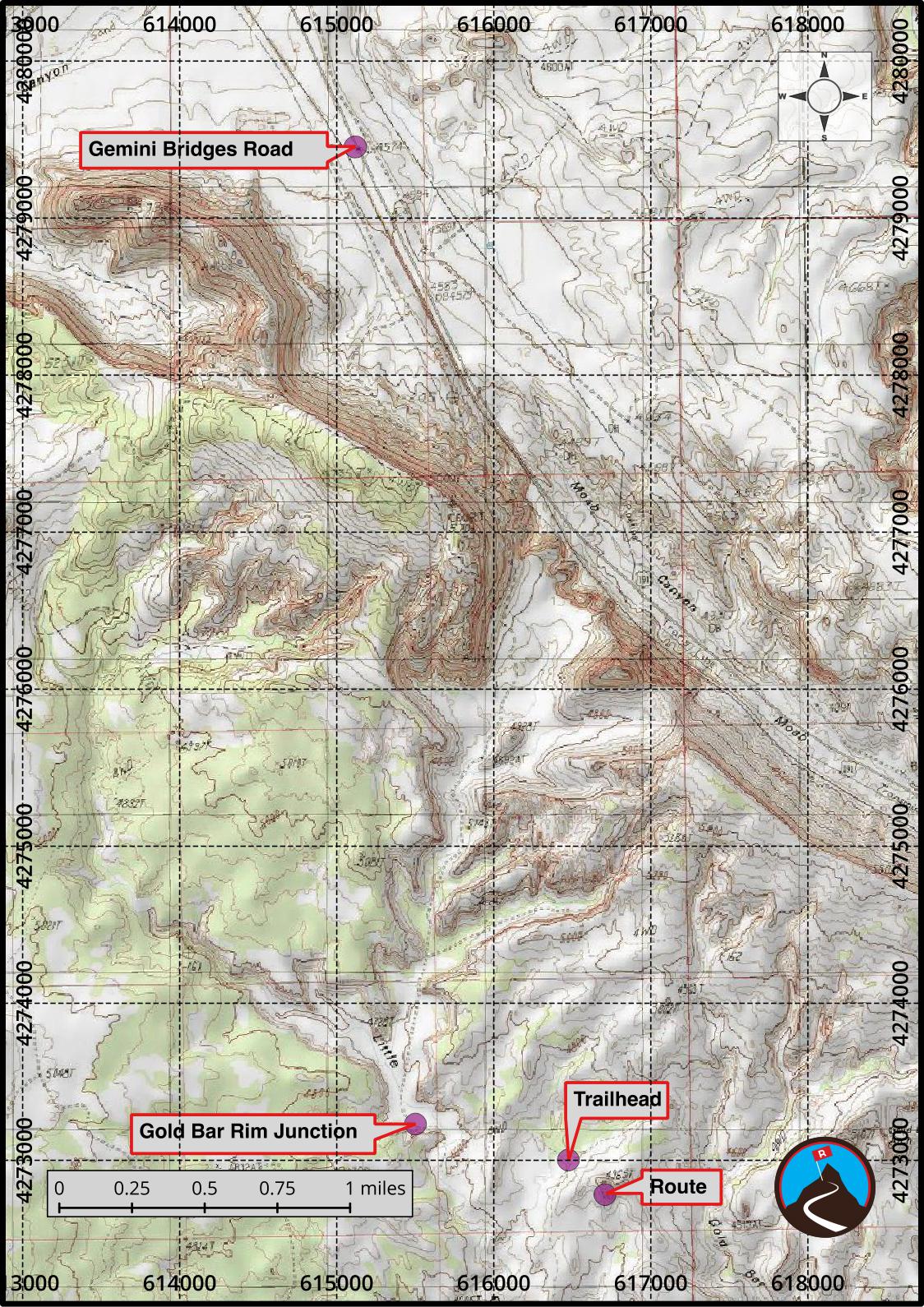 - Stay on the main Gemini Bridges road for 4.7 miles to the signed Gold Bar Rim junction. Right goes up a steep hill and to Gemini Bridges. You go left here instead, following a wash, then exiting up a steep hill. ( 12S 615501E 4273230N / 38°36'00"N 109°40'25"W )