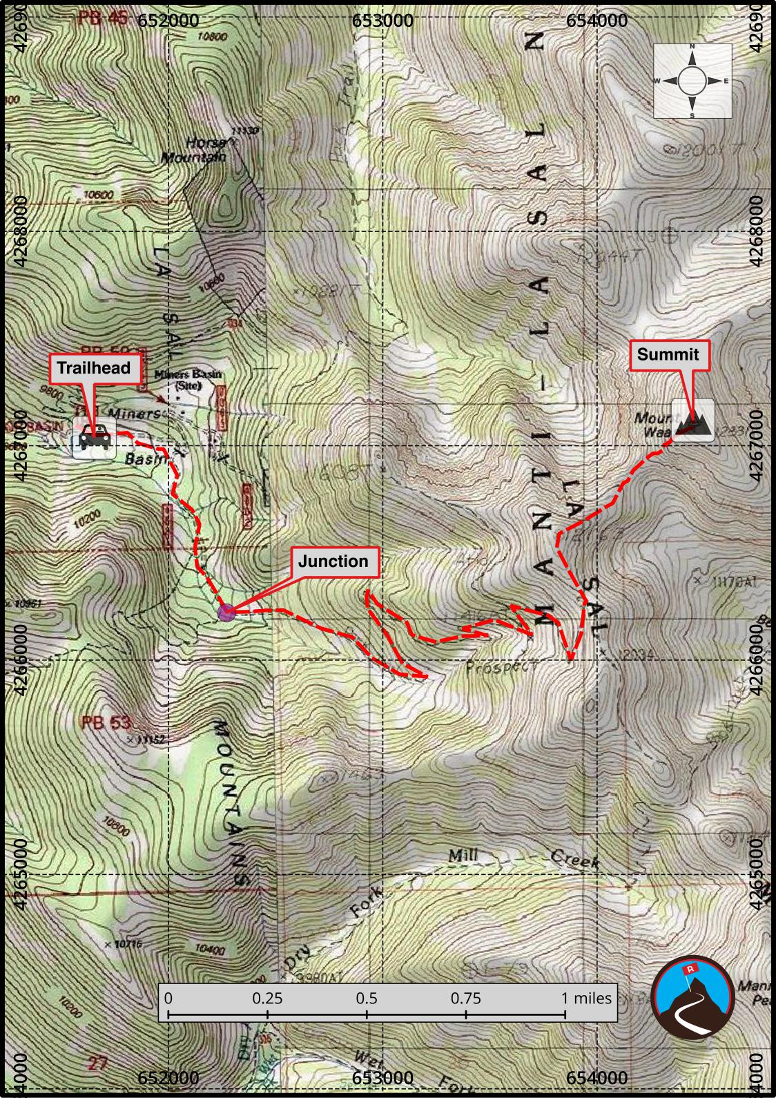 From the summit of 12,181, the route descends to the saddle, loosing about 300 feet in elevation before many switchbacks lead up the steep, rocky ridge of Waas re-gaining the 300' and an additional 300' of elevation to the summit.