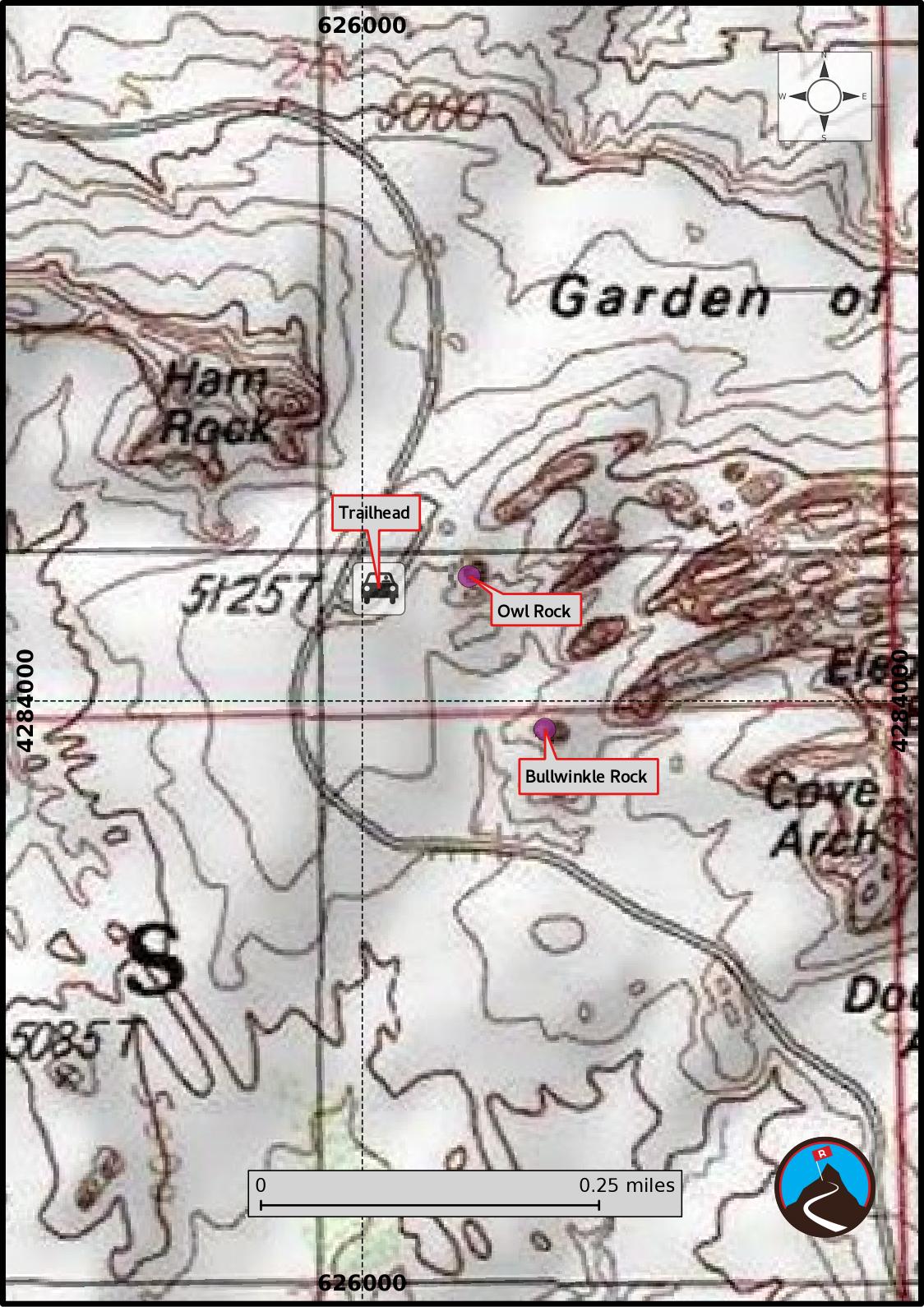 From the Arches National Park entrance and visitor center, follow the main park road about 9.2 mile to a signed junction to The Windows Section. Go right here, toward The Windows Section, for 1.1 miles to a pullout on the left. This is the Owl Rock pullout, and the trailhead.