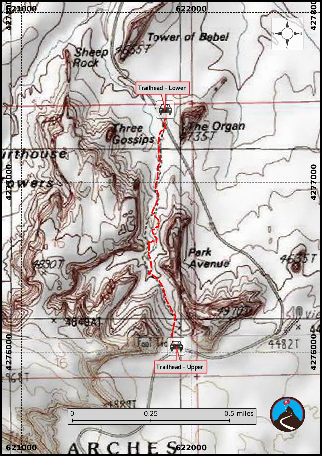 From the Arches visitor drive into the park, stopping at the well signed Park Avenue trailhead approximately 2 miles inside the park on the left side of the road. This is the Park Avenue Trail starting trailhead.