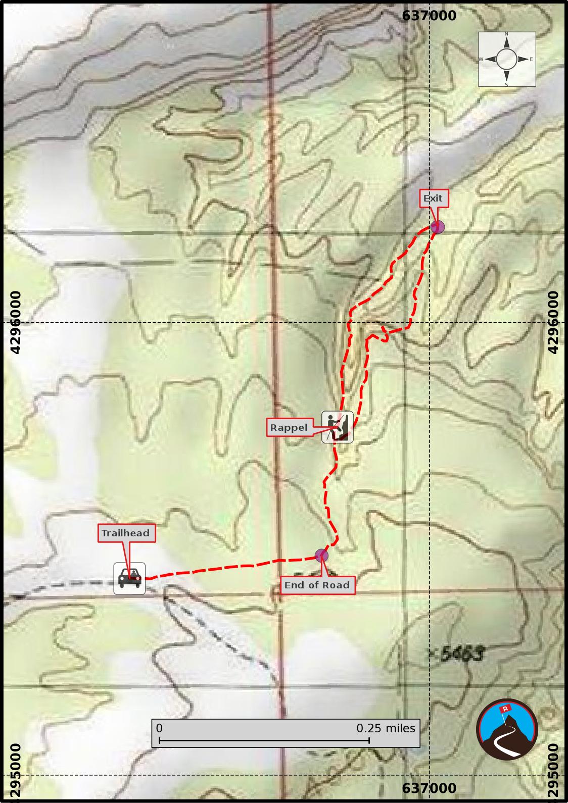 Also note, the exit trail passes right by the first rappel. I would strongly recommend fixing the rope for the rappel and retrieving it on the exit instead of trying to pull it from below.