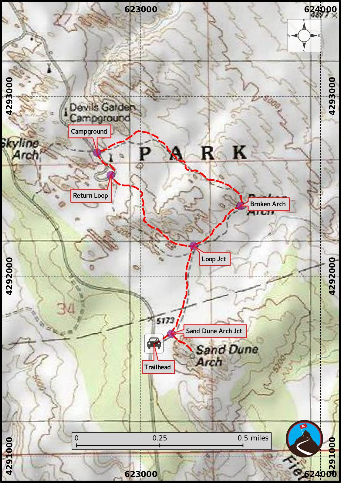 From Broken Arch, the trail meanders across open country, then to the Devils Garden Campground. From the campground, go south to the end of the loop road, where the trail picks up again. From the campground, the trail passes near large fins before reaching the Loop Junction again.
