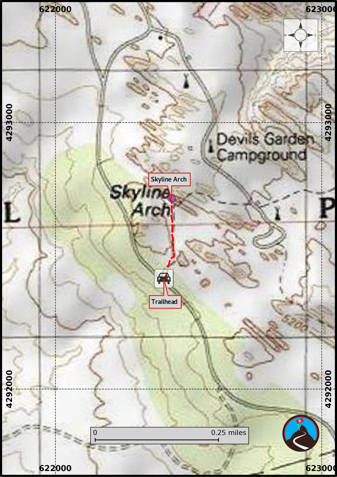 From the Arches National Park visitor center, follow the Arches Scenic drive 16.7 miles from the visitor center. The trailhead is signed on the right, and the arch visible from the trailhead. This is about a mile before the end of the scenic drive and campground.