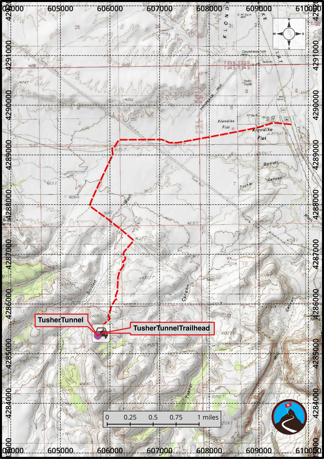 Tusher Tunnel is an interesting geological feature. A crack in the rock has allowed water to seep in until reaching a harder layer in the rock. Where it met the harder rock, it eroded a tunnel from one side of the cliff to the other. The tunnel length is likely 25 m ( 83 ft. ) or more in length, and high enough throughout to easily walk through.