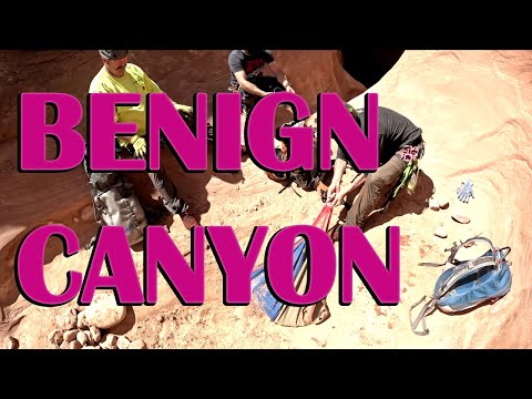 From the trailhead, follow the nearest wash as it heads northwest. It soon joins the main wash. This is Benign Canyon, in a quick 10 minutes or so it narrows and drops at a steep chimney downclimb. The anchor for the first rappel is visible just down canyon.