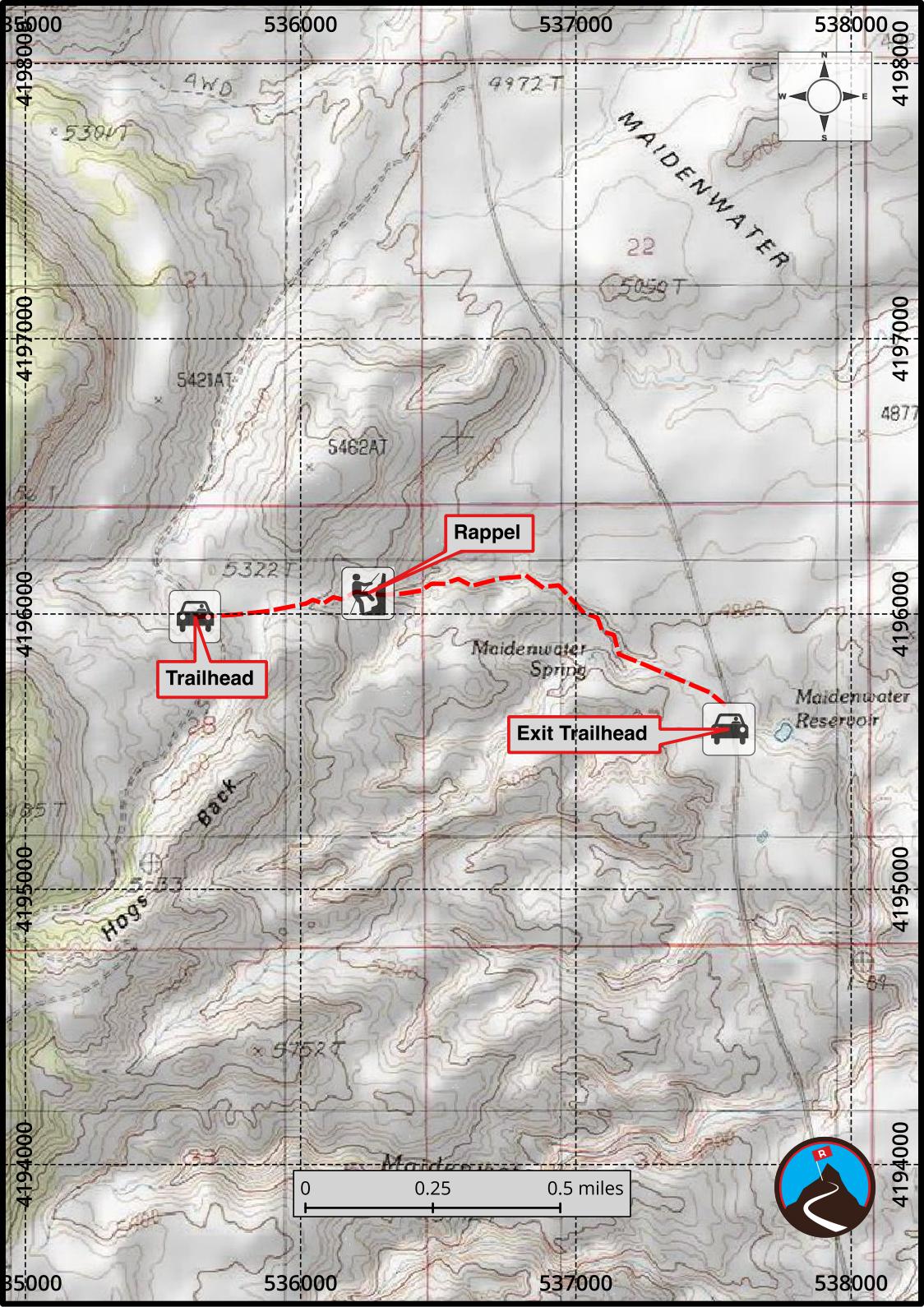 The grand finale comes up 2 minutes past the dryfall, a 12 m ( 40 ft. ) rappel. You will need to build a deadman, or find another suitable anchor for the short rap. Once down, the geology changes from granite to sandstone. Follow the shallow canyon down 15 minutes or so to Maidenwater Spring.