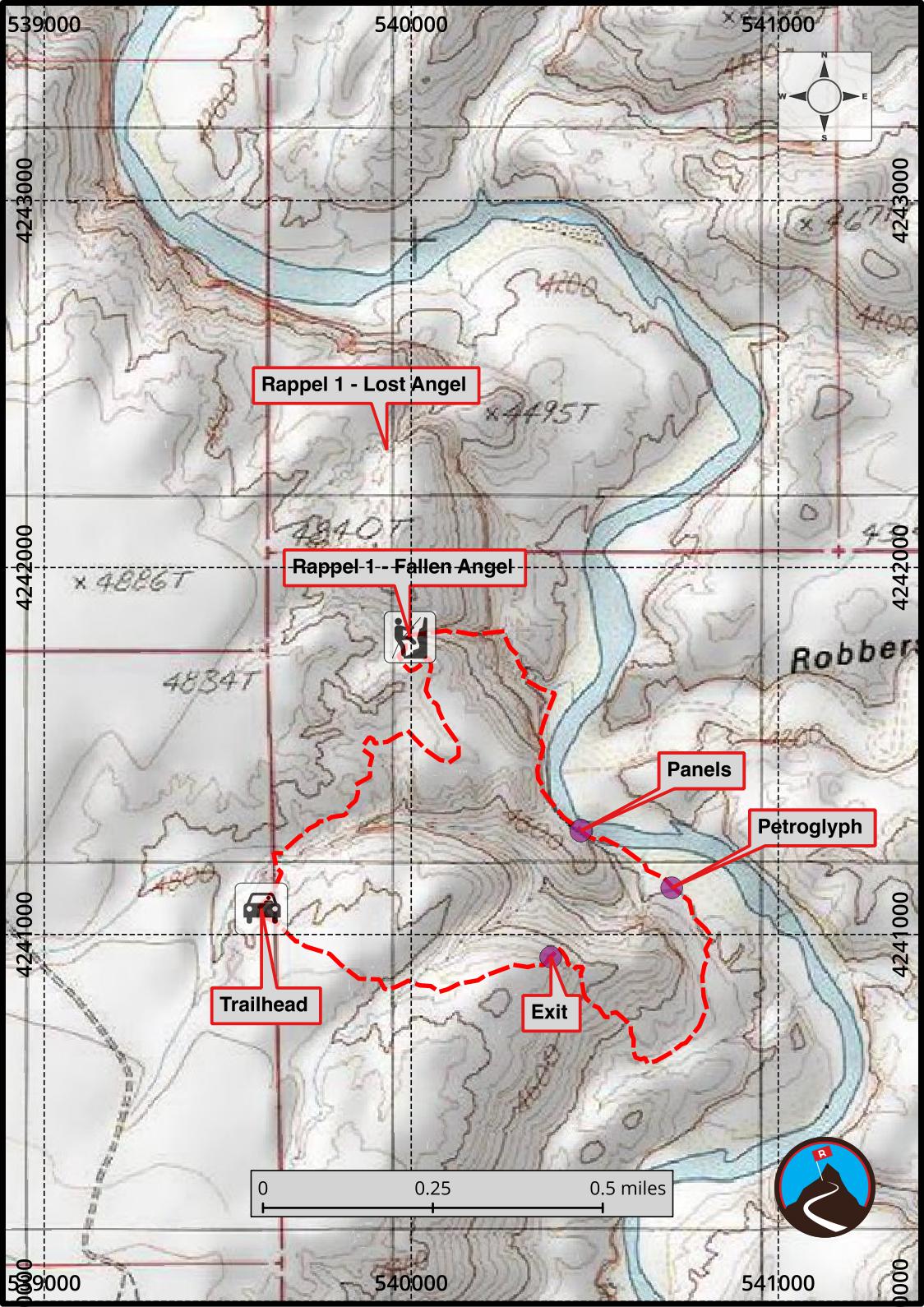 Fallen Angel is my least favorite of the Angel Slots. The canyon is short, with quite a bit of crumbly rock and somewhat light anchors. There were no recent signs of passage on our descent, and several anchors required placement or replacement. Because of this, it is probably best left for intermediate or better canyoneers with decent natural anchor skills.