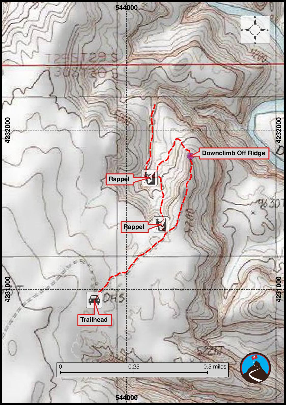 You have two options for doing Garden Balcony. Both will require some exposed easy 5th class slab climbing. The first option is to fix a short rappel and head directly down to the canyon. This is recommended, but will require both a 27 m ( 89 ft. ) and a 25 m rope. The second option is to downclimb the ridge and circle back to the canyon. Though easy 5th slab climbing, this approach offers exposure and requires good route finding. The ridge approach is recommended for climbers and offers a very elegant route.