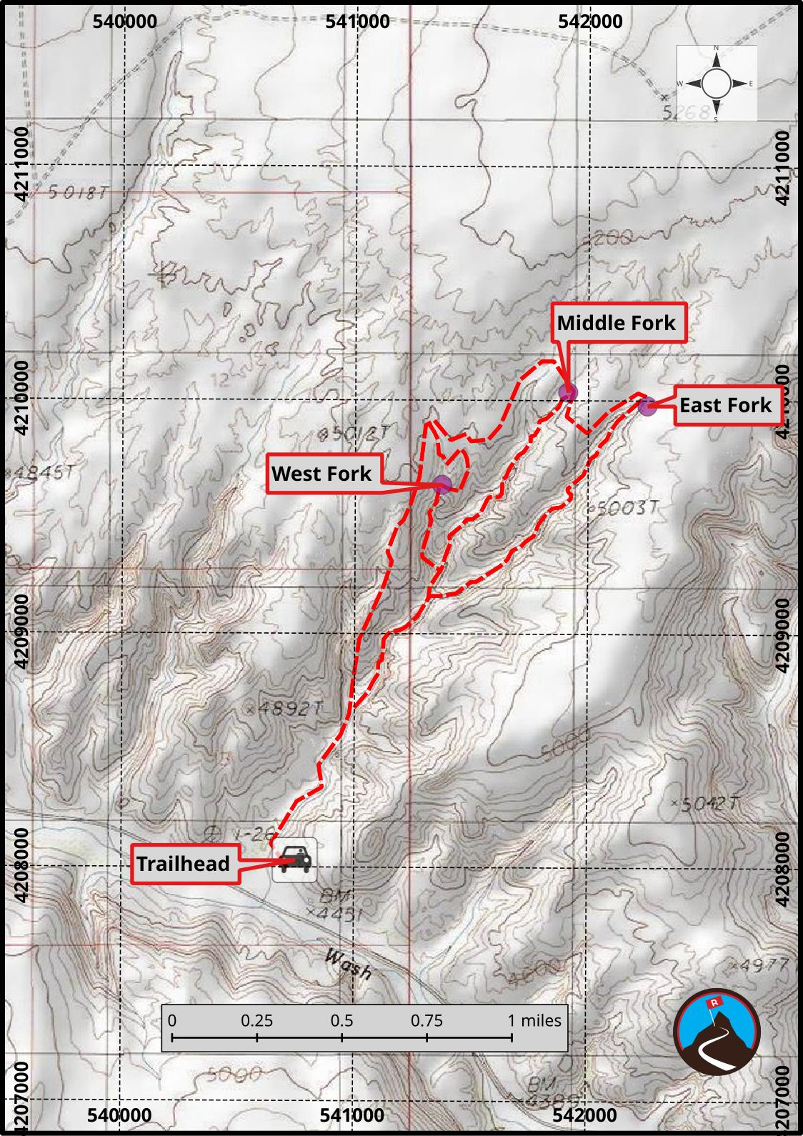 From the trailhead, hike up the canyon until a major side canyon comes in on the left (LUC). This is about 20 or so minutes from the trailhead, and not long after a mini-narrows. Hike up the rib between the side canyon and main canyon to reach the rim. If you use good route finding, nothing is over 4th class. Once on the rim, follow an emerging trail around to the head of the three forks. Orientate yourself carefully, this is complex terrain to navigate, and you want to make sure you are dropping into the fork you are expecting. The West Fork, in particular, is relatively small and easy to overlook. Follow the rim around to the fork you wish to descend.