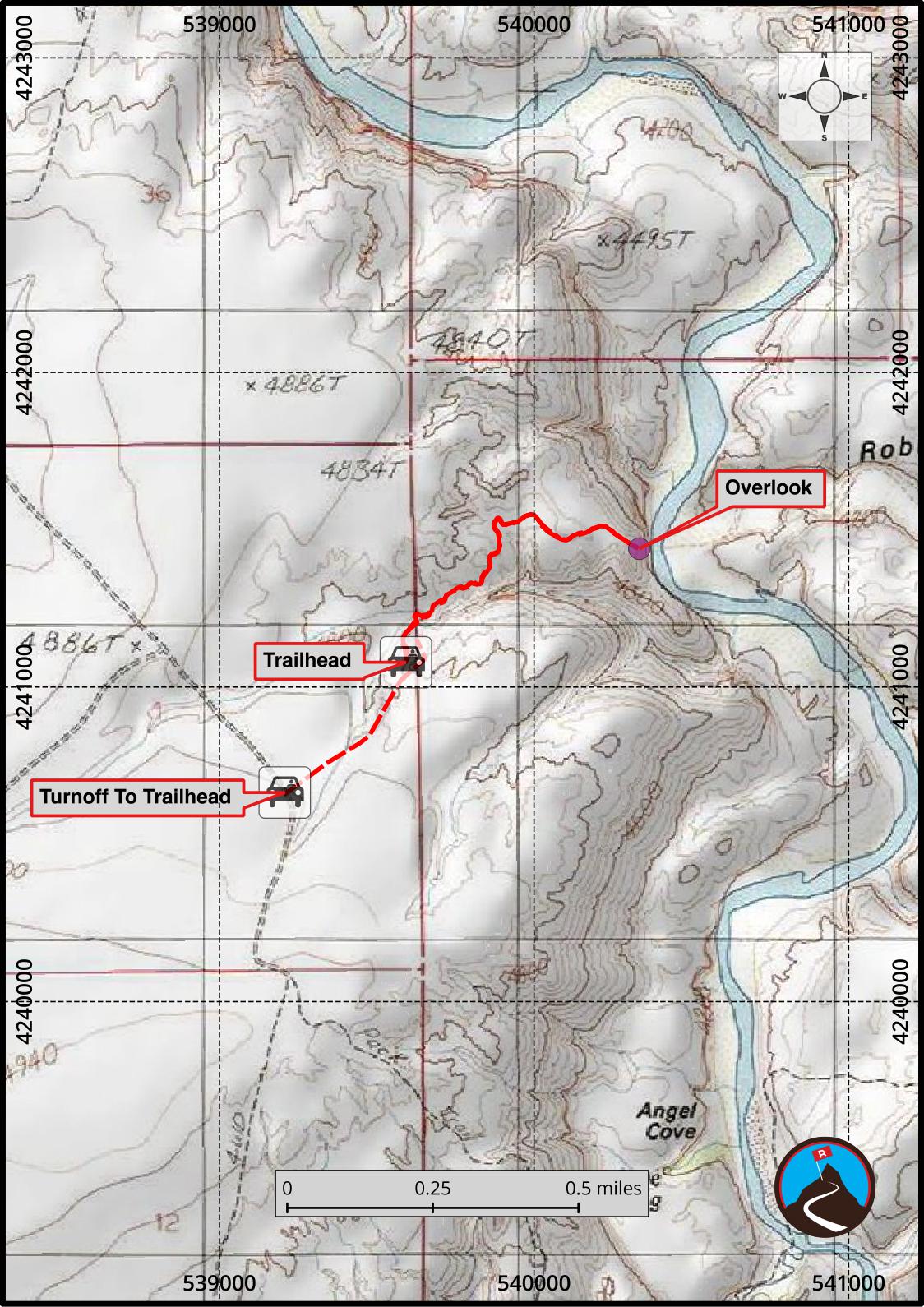 From the trailhead, follow the well used trail north, down, and across Angel Cove Canyon. After crossing Angel Cove, it bends and heads east. The trail is well used, and easy to follow. It ends at an overlook directly across from Robbers Roost Canyon. To the right is Angel Cove canyon, and straight below 600' is the mighty Dirty Devil River. A magnificent and airy pearch for viewing the Roost.