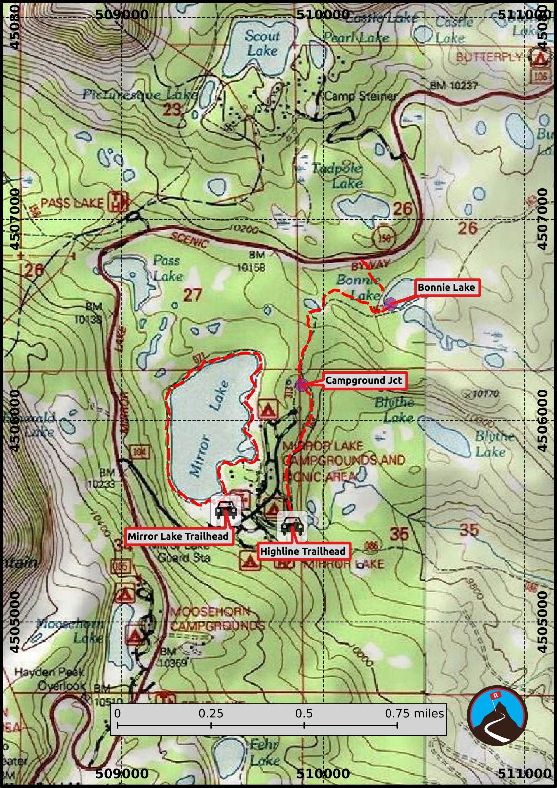 Bonnie Lake is often reached via a short few minutes walk from Mirror Lake Highway. The formal trail to the lake is part of the Highline Trail and starts at Mirror Lake proper. The lake is scenic but can be a bit overwhelmed with road noise.