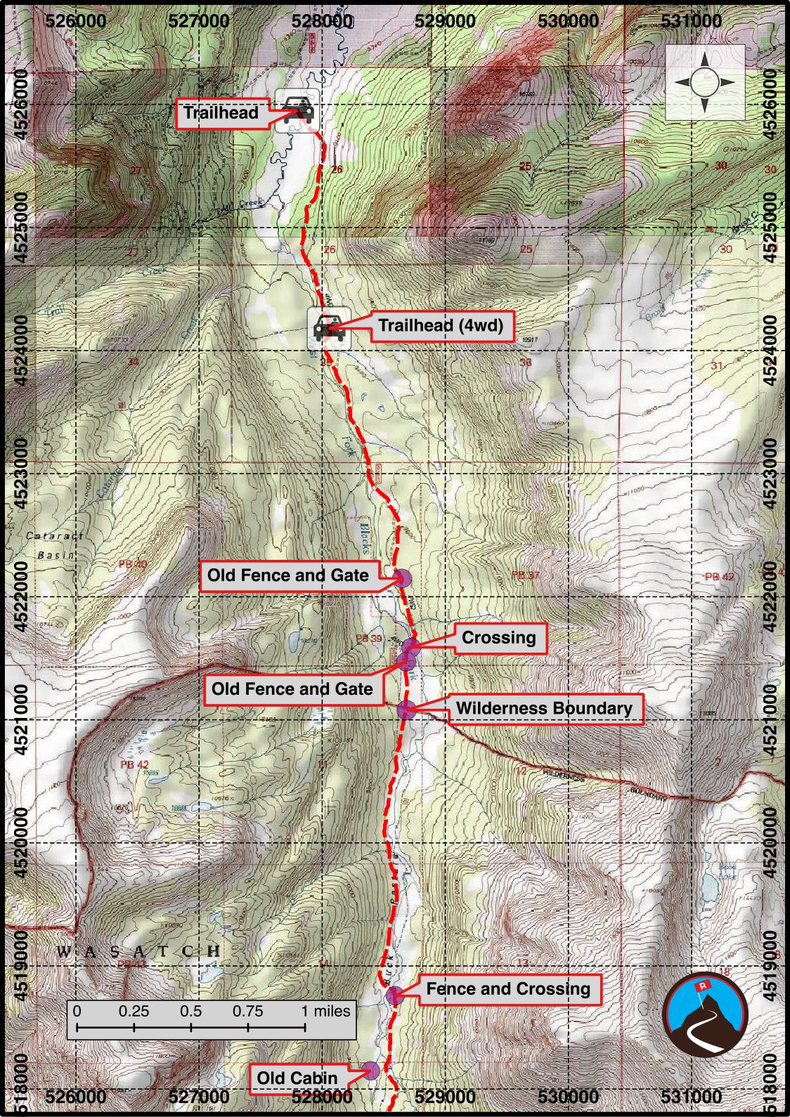 At the gate, continue on the West Fork of the Blacks Fork trail, which follows an old road to the south and crosses a small stream quickly. The Smith Bear River trail crosses the Blacks Fork trail at the gate. The old road is overgrown in a few spots but makes for easy travel. 1.85 miles from the gate, the trail reaches the first major crossing of the West Fork of the Blacks Fork River.