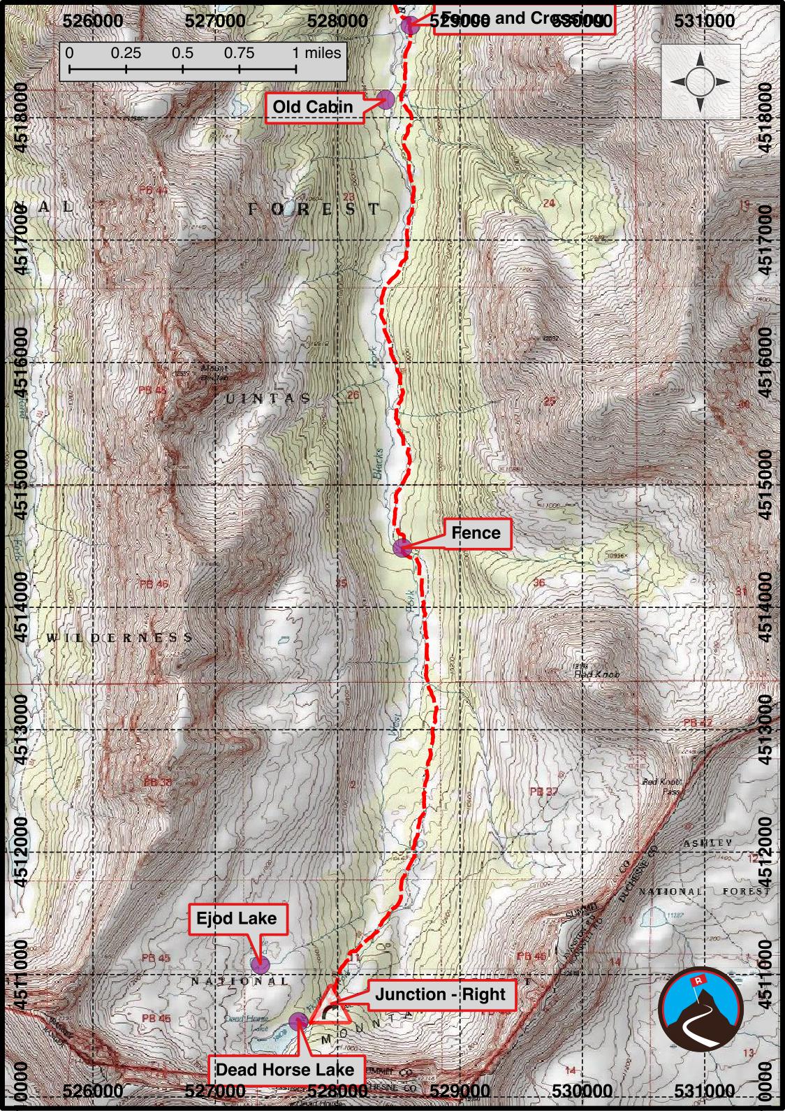 Just past the crossing, an old fence marks the end of the old road and the start of the old trailhead before the road was closed. Continue on the trail. It follows the meadow and soon enters the High Uintas Wilderness Area. Good camping begins from here on up.