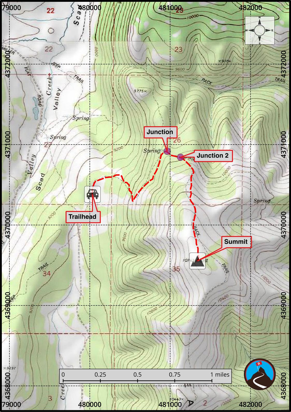NOTES: The last 2.1 miles to the trailhead are rough, and require high clearance. This could be walked if needed, and would add 1-1.5 hours to the day.