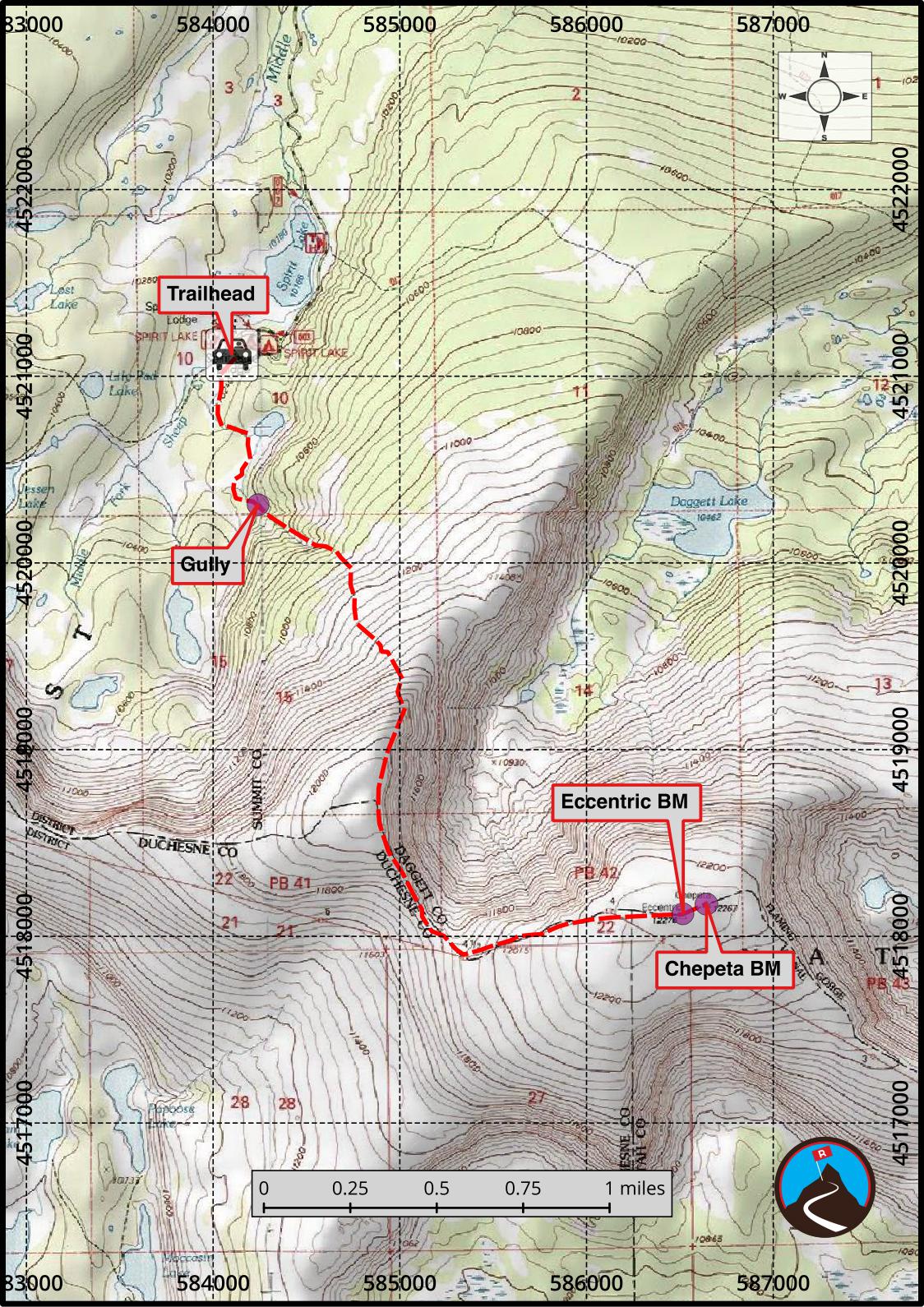 Once above treeline at about 11,000', it is easy navigation south east up to the summit of Daggett Peak. The summit of Daggett Peak offers great views south to Chepeta Lake, north east to Daggett Lake, and north west to Spirit Lake area and the lakes nearby. Continue south east down the ridge, across the saddle, and up the very rounded hill to the east. Eccentric BM and Chepeta BM are both on top, surrounded by large cairns a short distance apart.