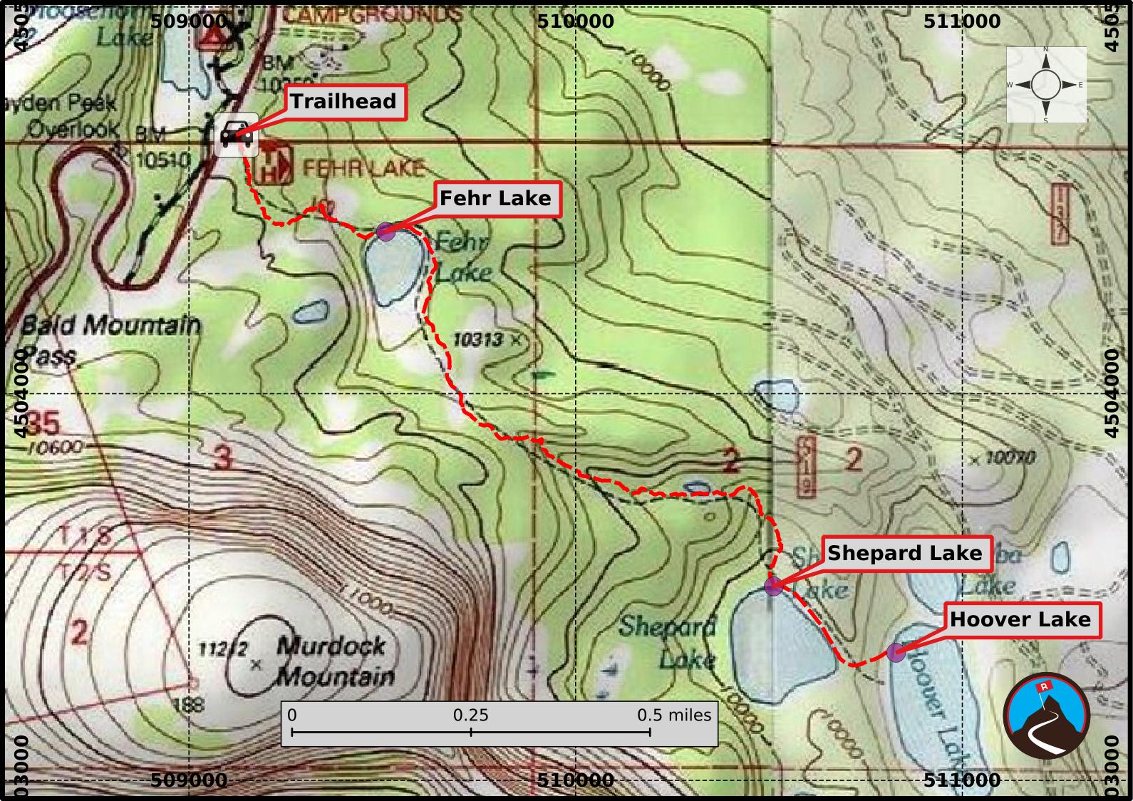 The trail continues along the west side of Fehr Lake, then head further west and descends a rocky hillside, passes a small pond, and continues its descent to Shepard, Hoover, and Maba lakes. These lakes are also accessible via the 4-wheel drive Murdock Basin road.