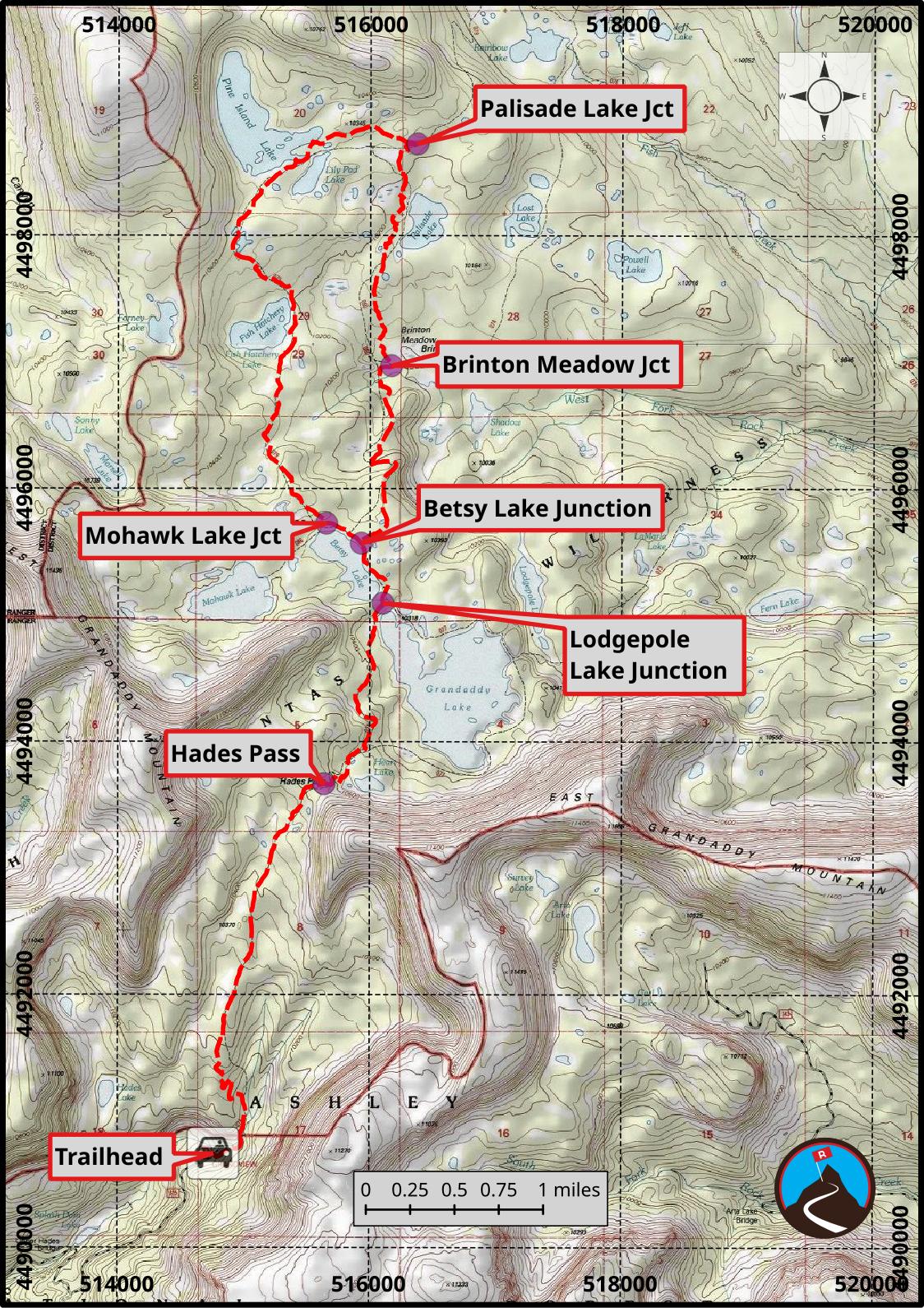 From Betsy Lake, return the way you came into the basin via Granddaddy Lake and over Hades Pass to the trailhead.