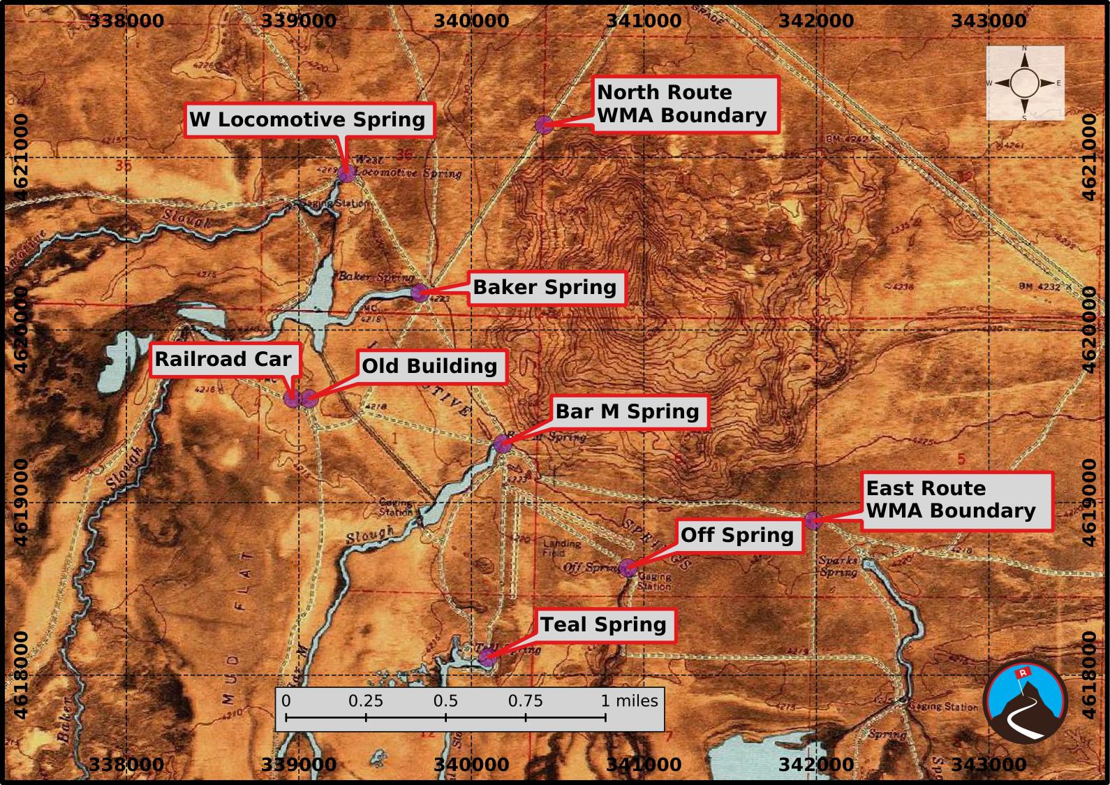 The largest springs that make up the WMA are Locomotive Springs West, Bar M Spring, and Baker Spring, Teal Spring, and Off Spring. These springs currently have ponds at them, and then feed impoundments that in wetter times would have held large pounds. Today aside from the ponds right at the springs, the impoundments are mostly dry with a small stream or wetland area running through them.