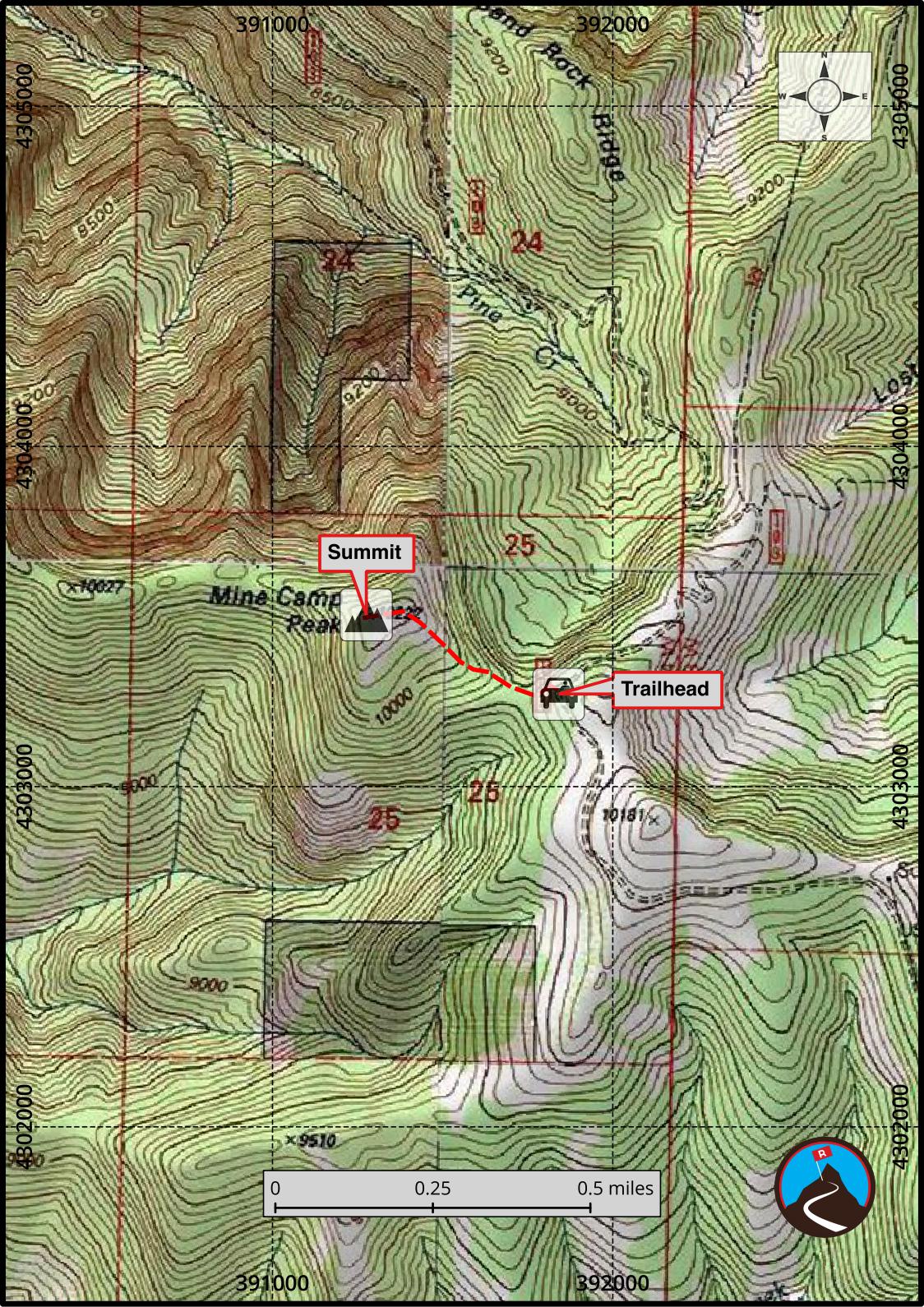 - 18.1 miles, park right before the cattle guard. A sign across the road points out Mine Camp Peak