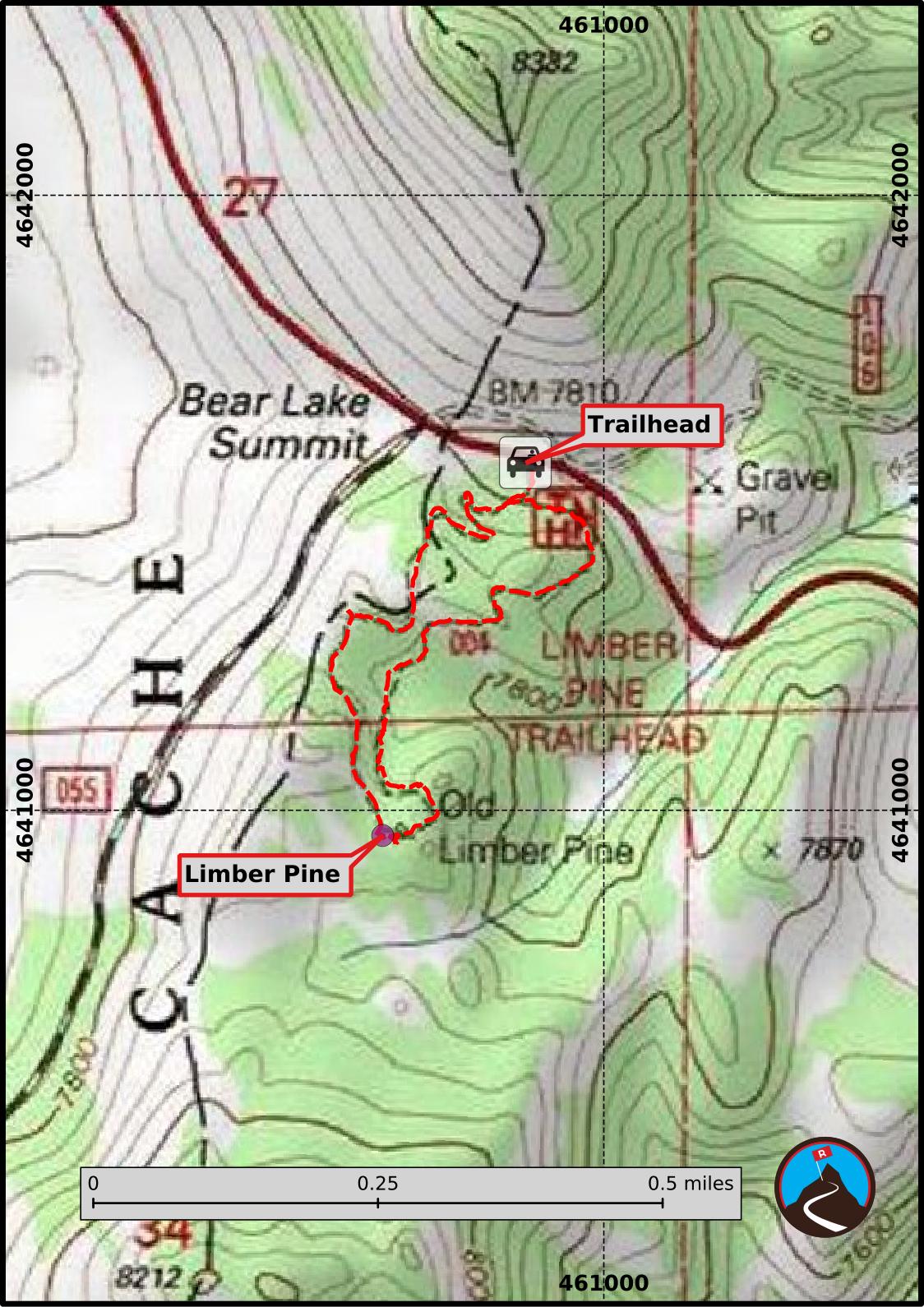 The Limber Pine marks about the halfway point, and the trail begins heading north back to the parking lot with an occasional view of Bear Lake to the east.