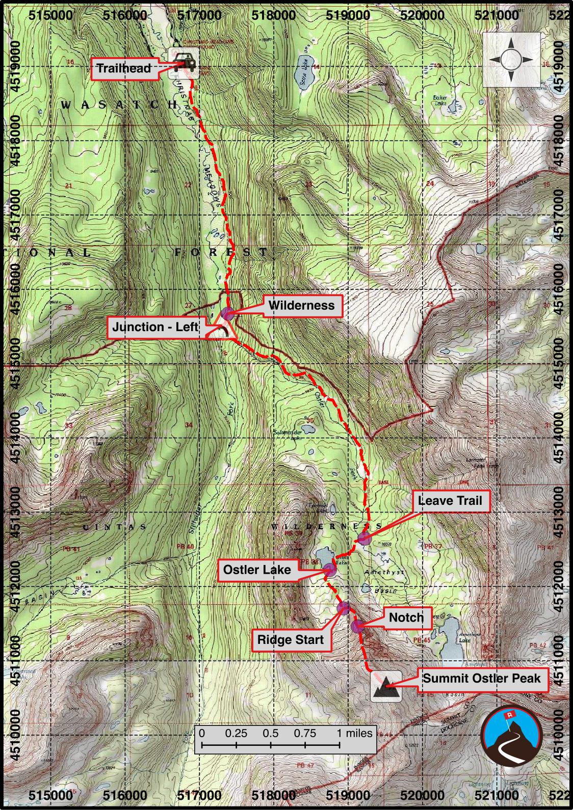 From the lake, take a good look at the north ridge of Ostler Peak. The route starts up the north ridge and generally stays either close to the north ridge or just west of it. Cross the wooded slopes and meadows to the base of the ridge.