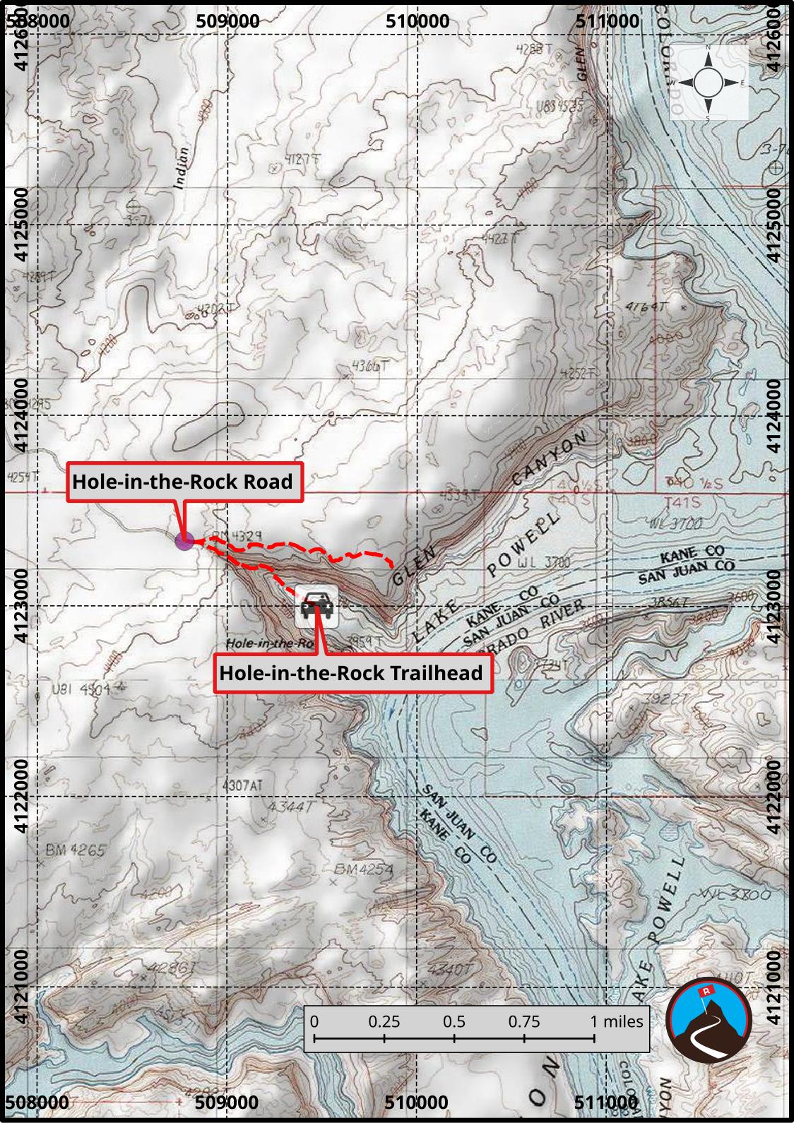 If you are interested in visiting Hole-in-the-Rock by car, see this description Hole-In-The-Rock - Hole In the Rock Road