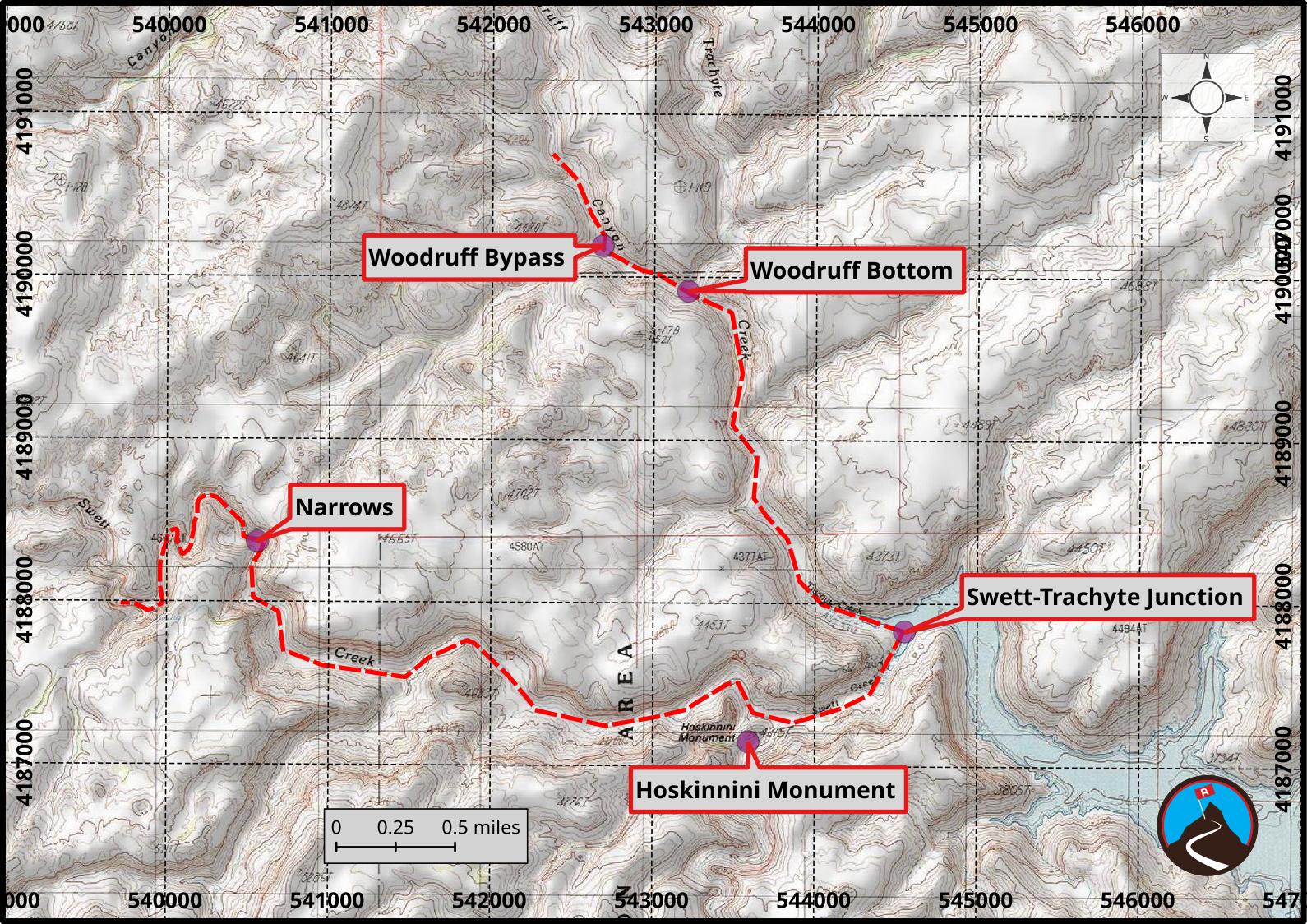 It is 2-2.5 miles up Trachyte to the confluence with Woodruff Canyon. It is the obvious side canyon coming in on the west (left) side. En route Trachyte usually has sections of flowing water and seeps coming out of the walls in places.