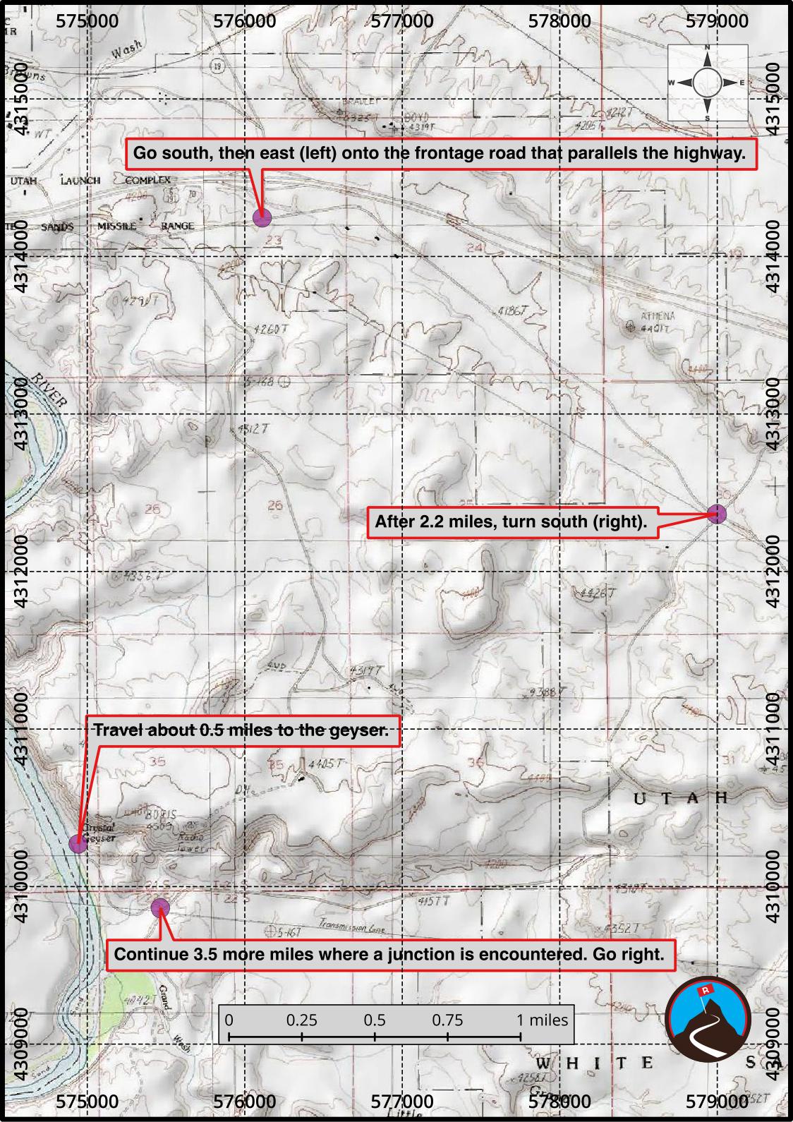 The geyser is a large flat area with a pipe sticking out. Eruptions of the geyser have created a large amount of yellow flowstone as the water drains down to the Green River a short distance away. It follows common sense, but please do not put anything in the pipe or try and approach the pipe during an eruption.