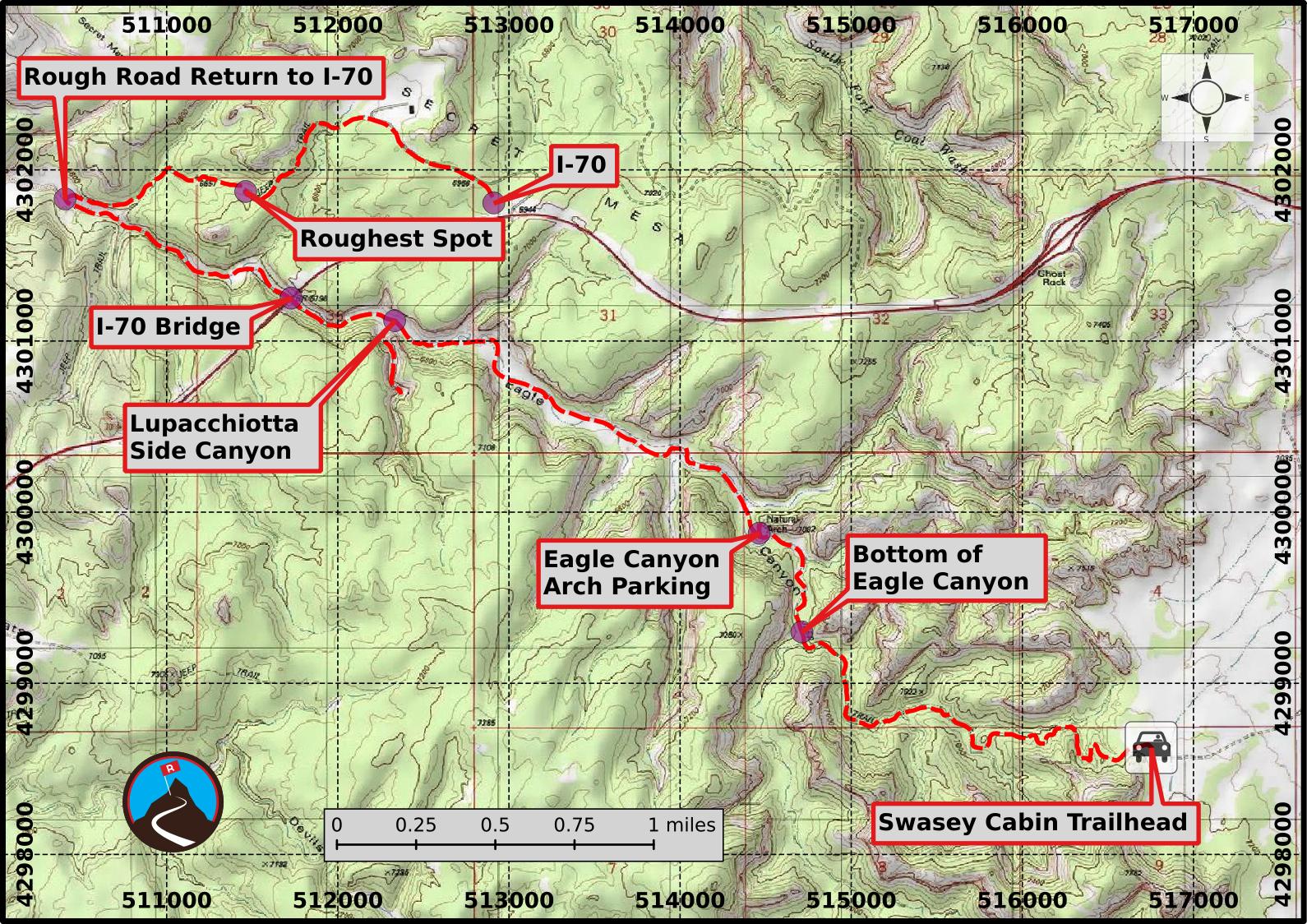 Eagle Canyon Arch is an impressive arch tucked into the bottom of Eagle Canyon, south of I-70. The arch, though only having a span of about 12 feet, has a height of about 50 feet and looks dramatic in the context of the deep walls of Eagle Canyon. Reaching the arch can be done either via four-wheel drive vehicle, ATV, or by foot.