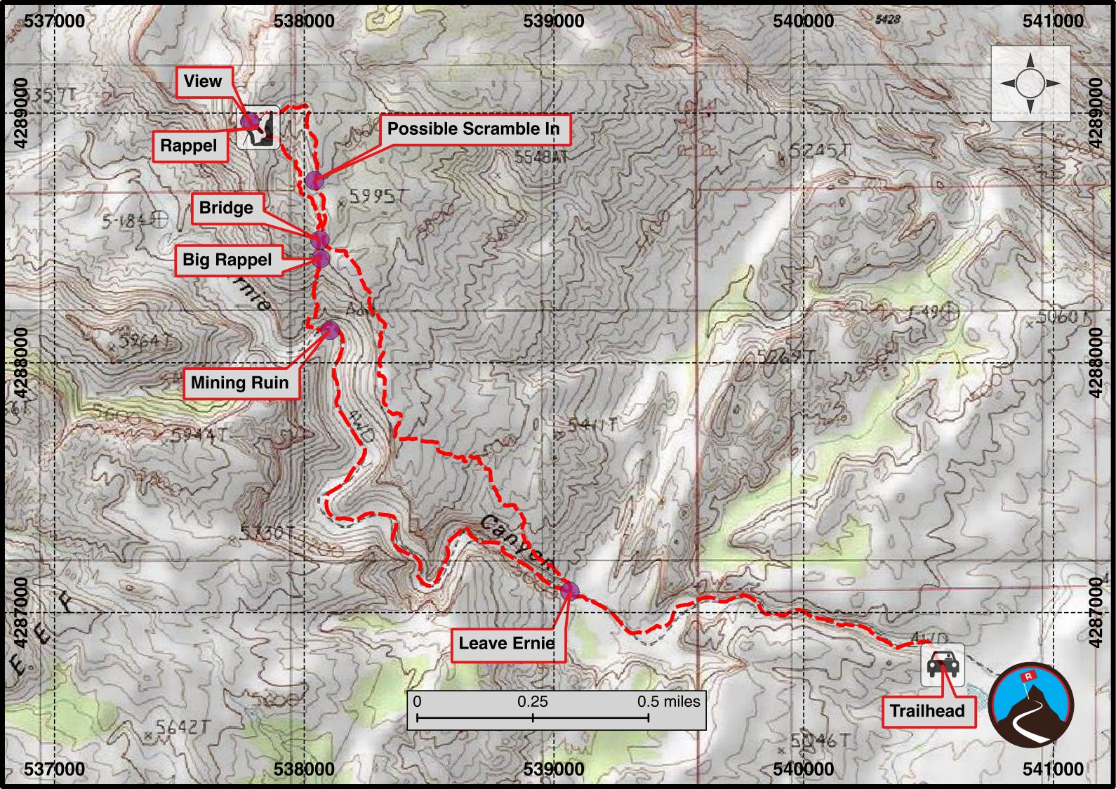 It is about 2.75 miles from the last rappel down Ernie Canyon and back to the trailhead.