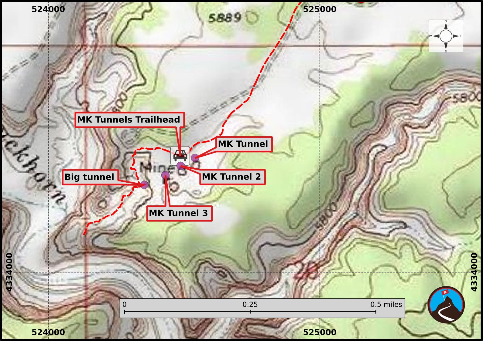 For a short hike, find the old and now mostly eroded road that heads west and down the steep hill to the lower area below. Follow this road down to the flat area below. In the south-east corner of the flat area is an enormous tunnel. The tunnel, unfortunately, is closed off, so you can't access the tunnel behind, but it looks incredibly fascinating. The area around the tunnel was clearly where they dumped the material removed to make the tunnel. A few old mining relics litter the flats, but there isn't much left these days.