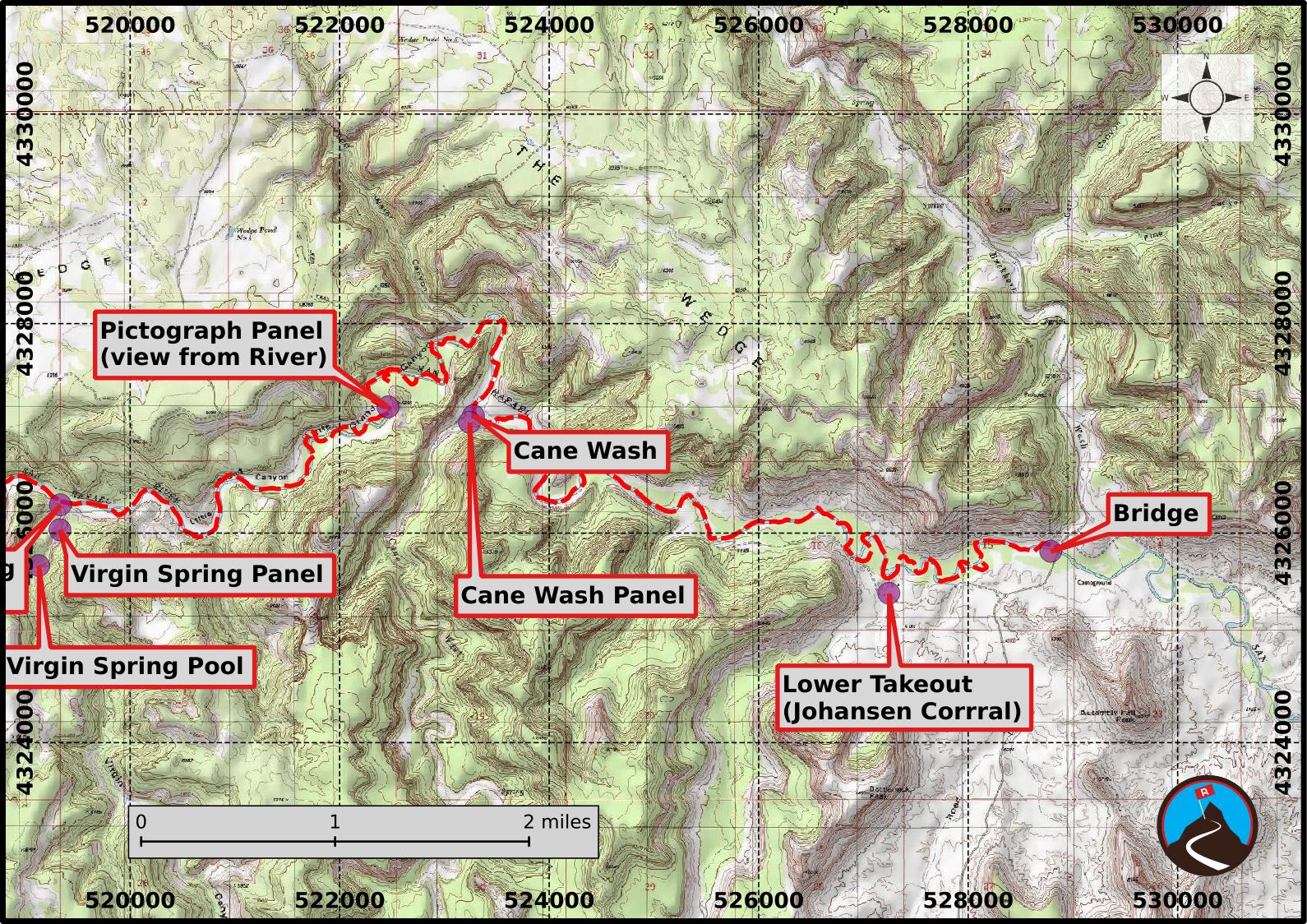- If you are traveling by foot or horseback, (or want a shorter float) continue past the bridge 0.4 miles to a road on the right. ( 12S 528342E 4325411N / 39°04'38"N 110°40'20"W )
