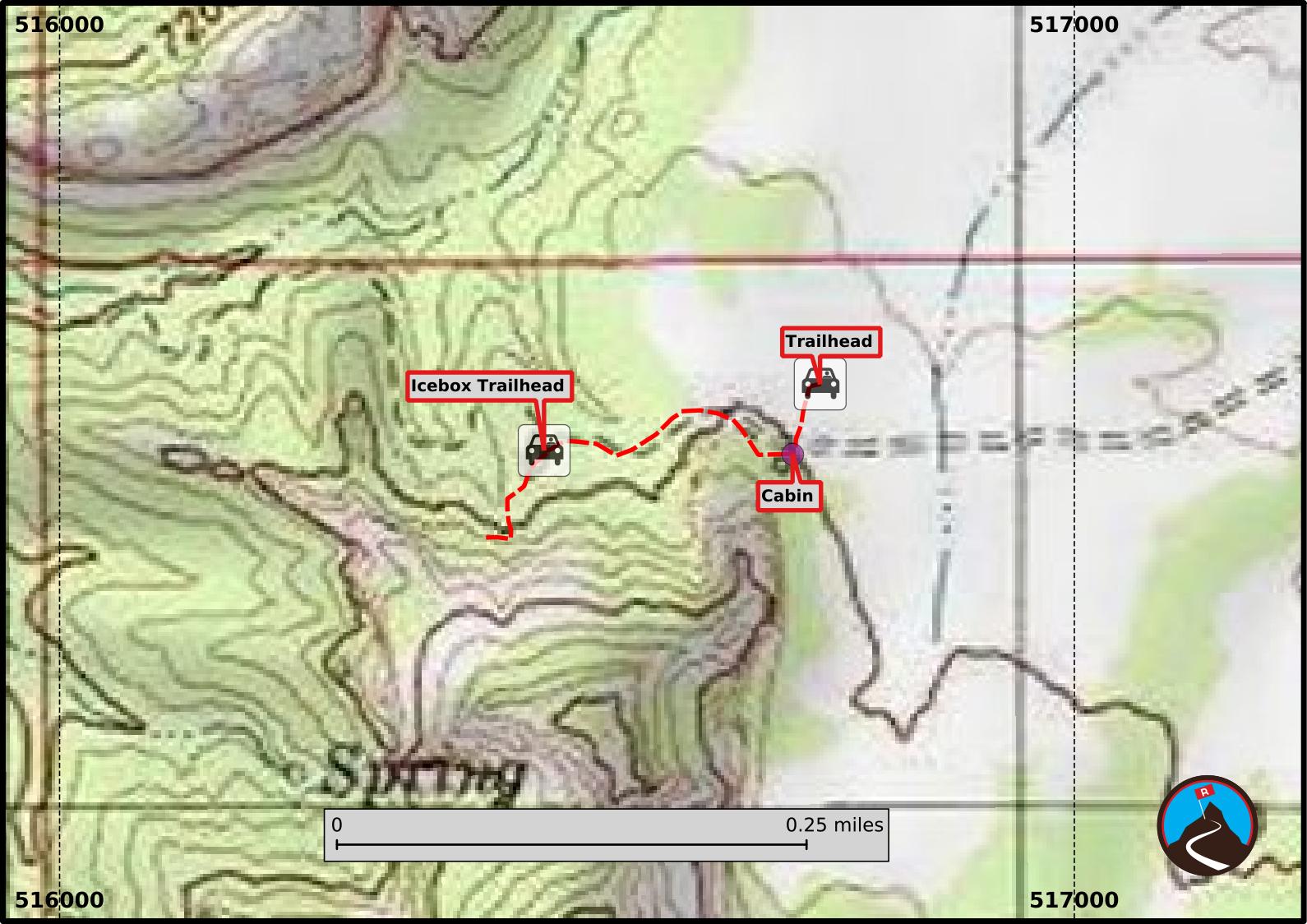 Take the Icebox trail a short distance. It passes an old fence and trough. Just beyond the trough is a narrow canyon ("cave") that is interesting to squeeze up into. From the first "cave", the social trail goes west a very short distance around the corner to another "cave". I am unsure which one, or maybe both, are referred to as the Icebox. An interesting place to visit!