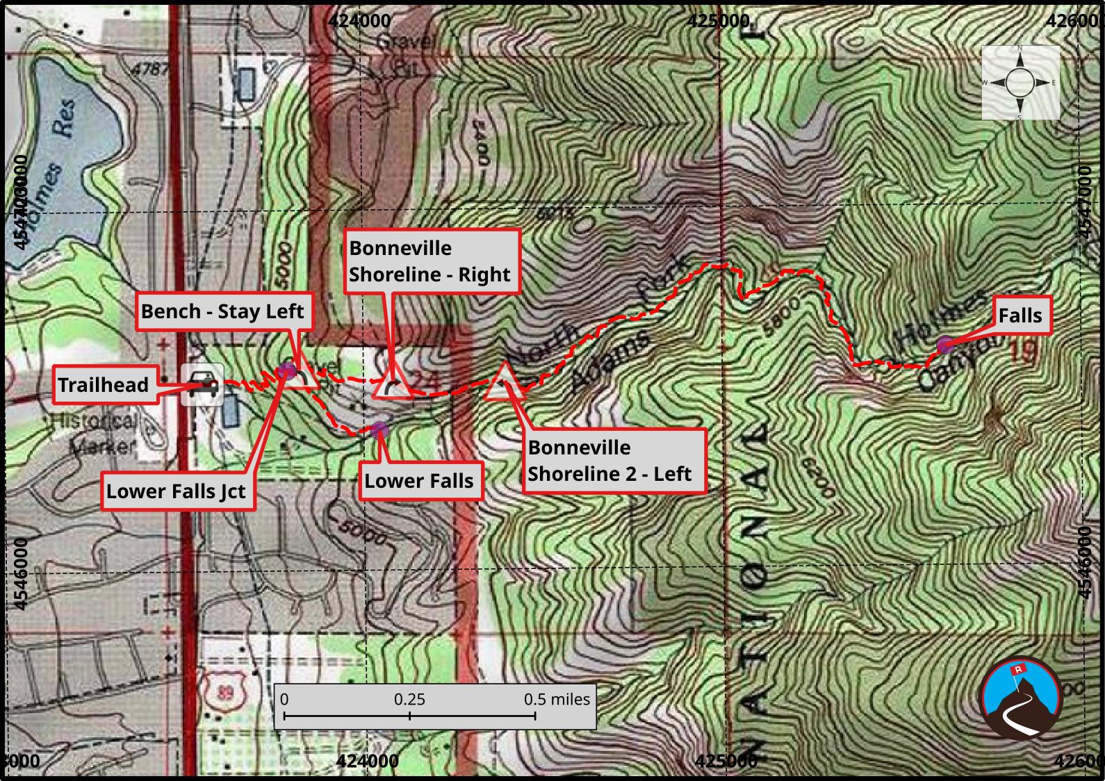 The trailhead is off of US-89 near Fruit Heights. If coming from Salt Lake City, take the US-89 exit from I-15 about 10 miles north of Salt Lake, signed South Ogden. Follow this for about 6 miles to the Oak Hills Drive exit. Once off US-89, turn right, then left on Eastside Drive.