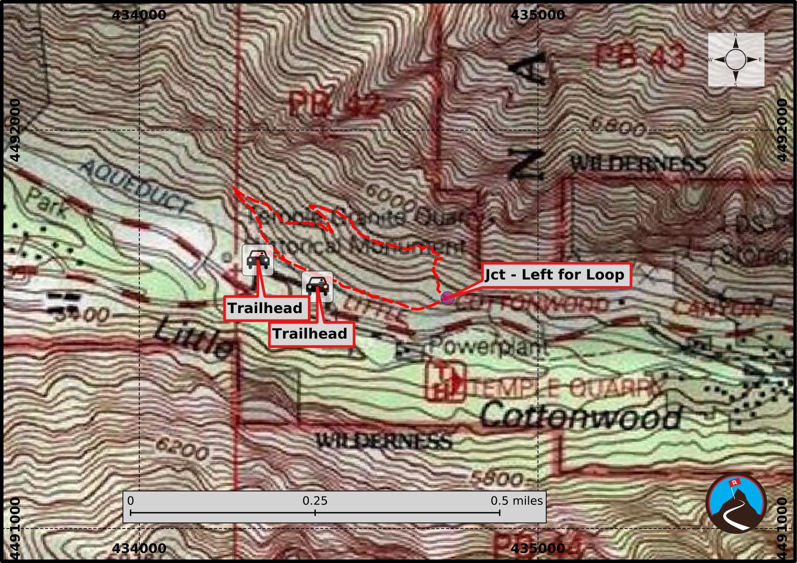 Either direction works, I liked counter-clockwise. If going counter-clockwise, the trail begins mostly flat on an old pipeline and heads east into the canyon. There are a few minor side trails that go to climbing areas. Stay on the main trail.
