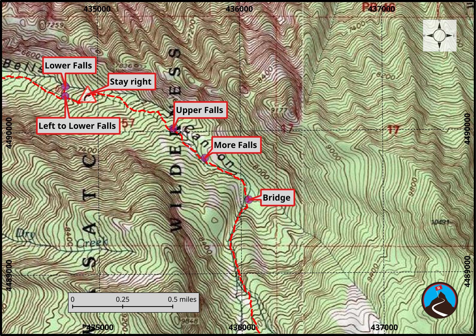 From the junction with the lower falls, continue climbing up the right-hand trail. This is rocky and a bit less traveled than the section below. Not far above the lower falls junction (5-10 minutes or so) a side trail goes off on the left. This goes over to Bells Towers on the north side of the canyon and is used by climbers. Stay right!