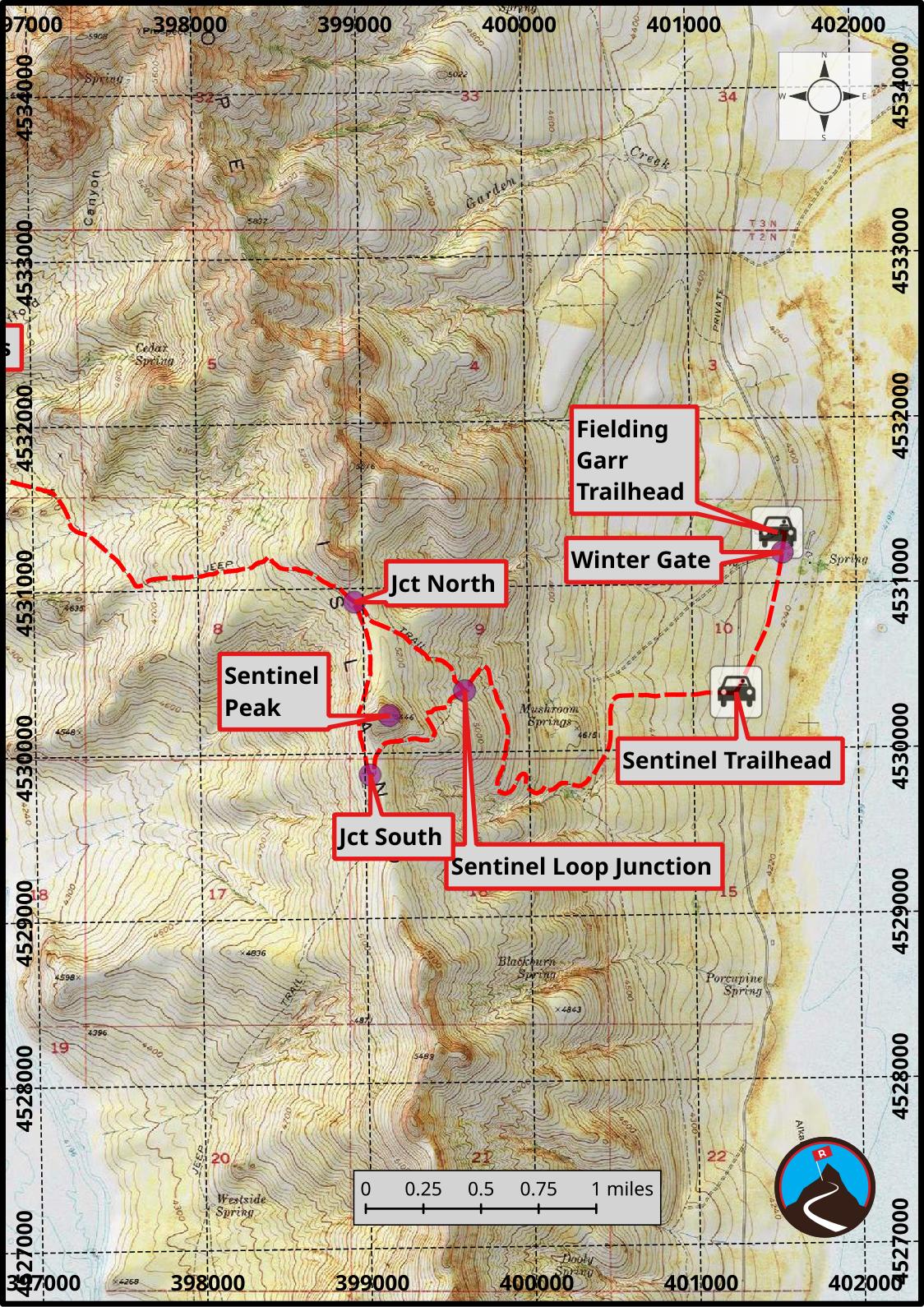 If hiking in the winter when the road is closed, and starting from the Fielding Garr Trailhead, head south on the road which turns to dirt at the gate, and follow it for 0.6 miles to the Sentinel Trailhead.