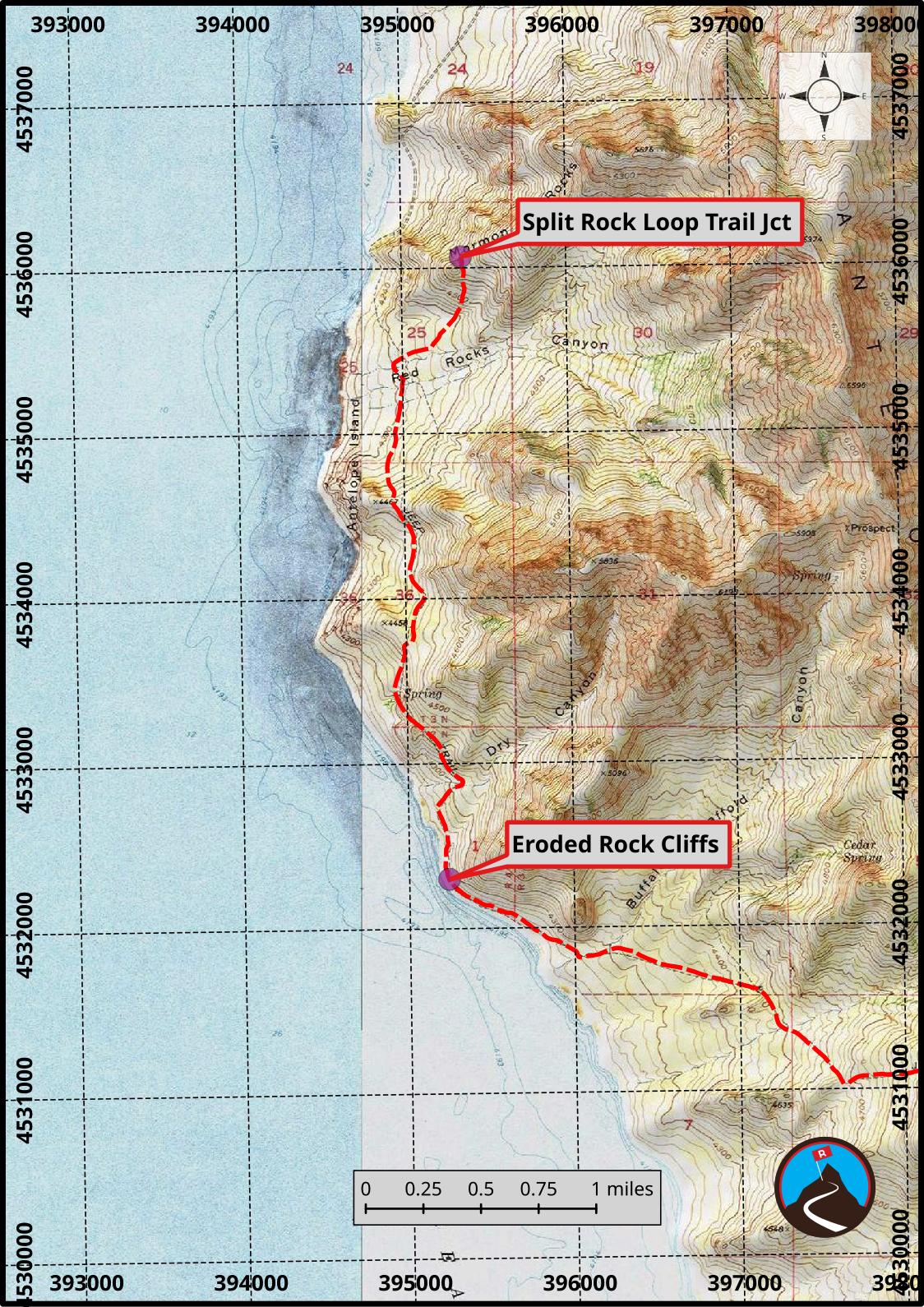 West Side Trail / Buffalo Scaffold Canyon Trail is a long, remote trail that traverses from the east side of the island to the west side, then follows the western shore north to meet with the Split Rock Loop trail. This trail doesn't see as much use as many of the trails in the park. If you are looking for solitude, this is an excellent choice. Some bikers use this trail as part of a long loop from White Rock Bay, but usage is minimal. For hikers, this is an out-and-back, so you can choose your length based on motivation. From the trailhead to Split Rock Loop Trail is about 16 miles roundtrip, see Split Rock Loop Trail for details on even longer outings.