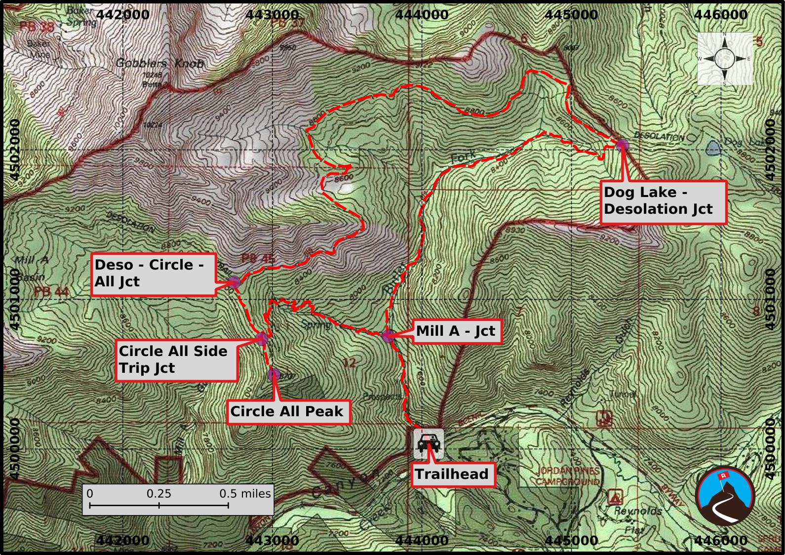 It takes an hour or hour and a half to reach the prominent Mill A Jct from the top along the Desolation Trail. Go left here. Just 5 or so minutes down from this junction, the trail forks just before it begins its big descent. Right goes to Circle All Peak, about 0.2 miles away. After visiting the peak, go down at this junction. The trail makes a handful of switchbacks as it steeply descends back to the Mill A Basin Jct. Go right at the bottom to the trailhead. An amazing loop.