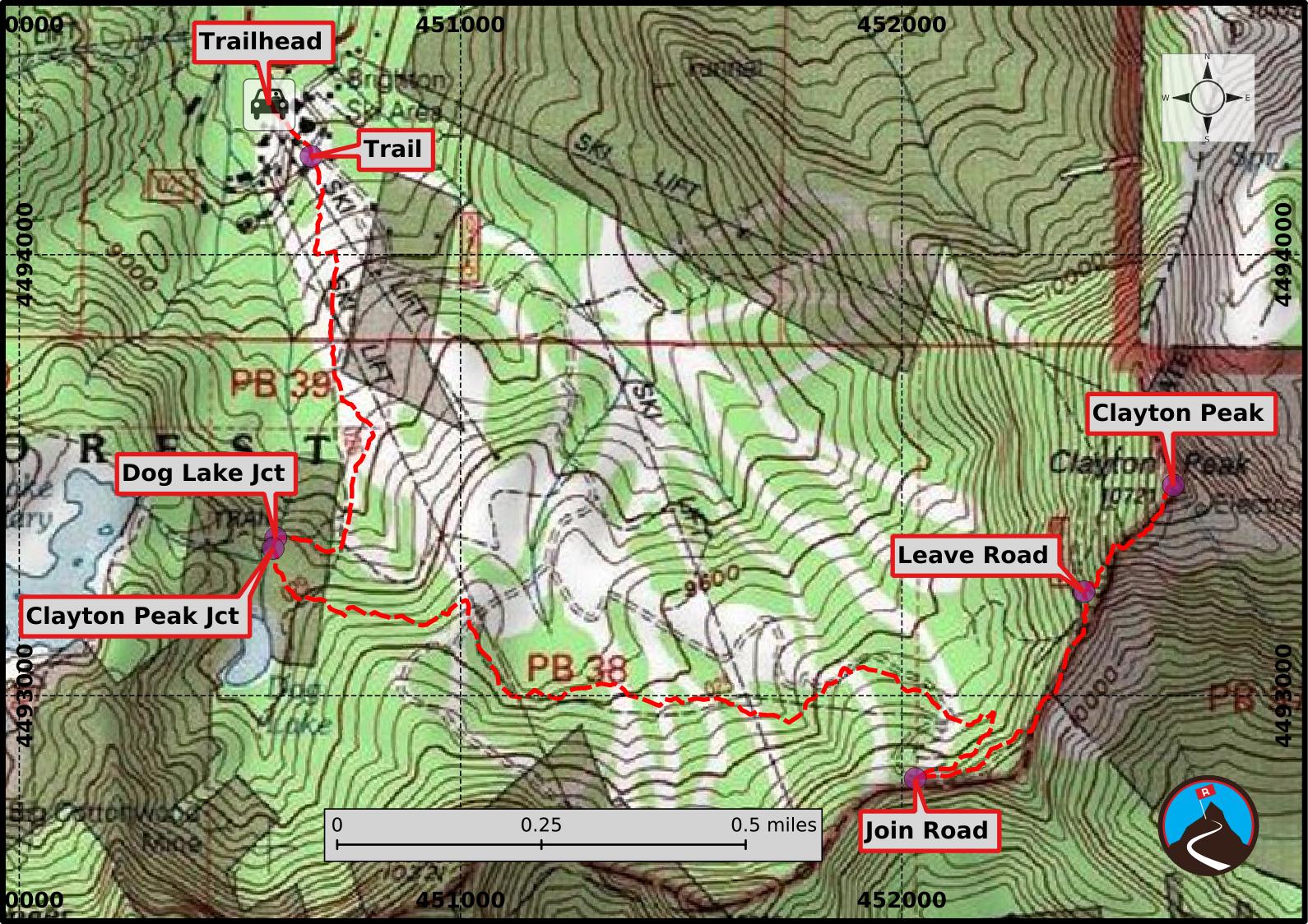 From the Brighton parking lot, go just right (south) of the main Brighton building. A path leads up the slope, then heads right and passes between large logs to become a single narrower track. The single track switchbacks up the hillside, crossing under the ski lifts, before heading more south after a short steep section. The junction to Dog Lake is reached, go left here, then almost immediately left again on the signed Clayton Peak Trail.