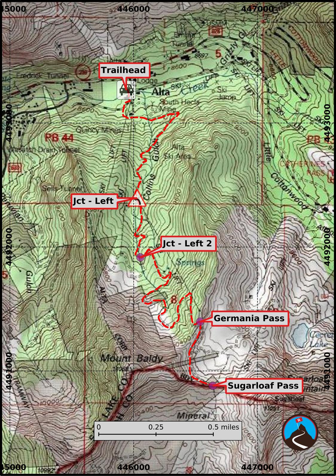 Navigation is easy. From the WIldcat Base entrance at Alta, the trail begins on the east side of the parking lot. Follow the trail up to the dirt road. Note, a signed single-track trail leaves on the left here. That is the Albion Meadows trail, go right instead on the obvious dirt road. The dirt road heads west briefly, then turns, passes under the Wildcat and Collins ski lifts, and begins climbing up steeply.