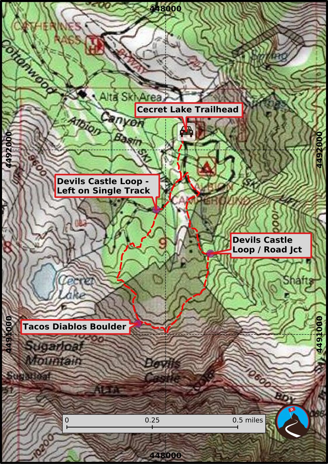 Continuing from the boulder, the trail follows the base of Devils Castle east for a few minutes, then heads north and intersects with the Point Supreme service road. Go left here, following the service road. It meanders down through some houses, then reaches the Albion Basin Campground. Go left on the campground road to circle back to the trailhead.