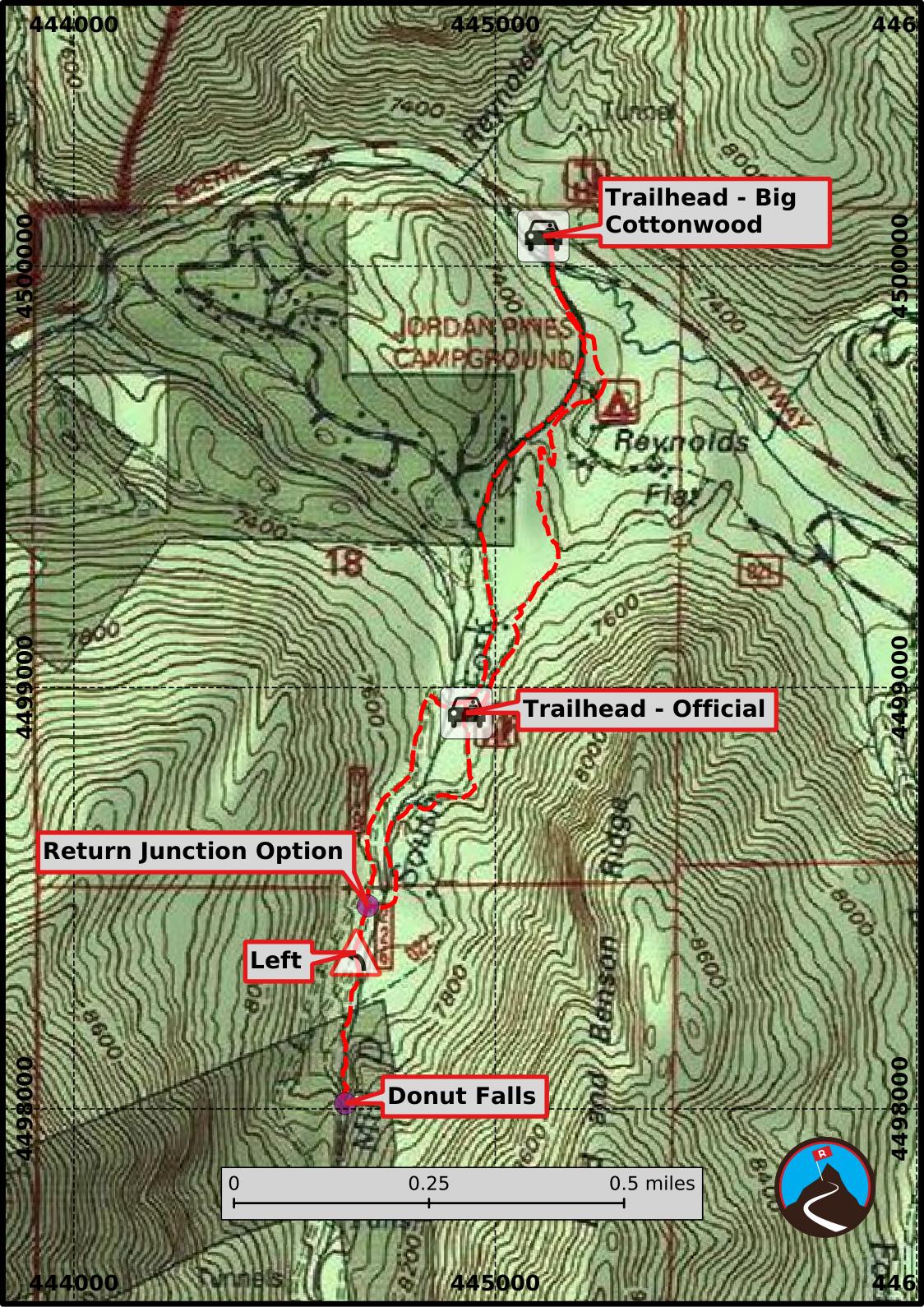 Drive up Big Cottonwood Canyon. The trailhead is at 8.9 miles, where there is a large parking area on each side of the road. Park on the right side of the road. There is a toilet here and gated road (open in the summer) that heads south to the Jordan Pines Campground and Forest Service Donut Falls Trailhead.