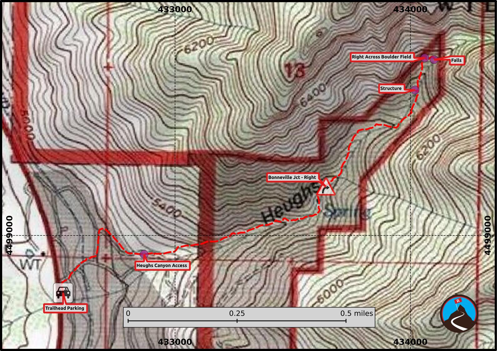 The trail crosses the creek on a primitive log bridge and continues ascending Heughs Canyon. More open views of the quartzite rock outcroppings that make up the area come into view. Keep an eye out about 0.5 miles from the Bonneville Jct for an interesting log structure/camp on the left. Just after the structure, the trail crosses the creek again and makes a quick ascent to a boulder field.