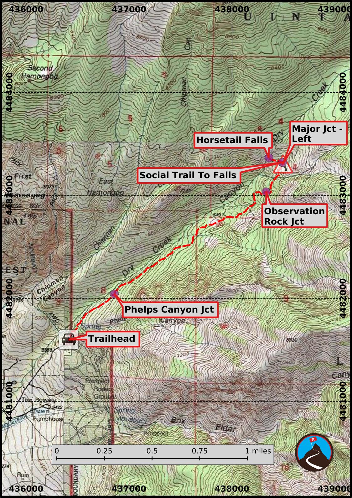 The trailhead is the Deer Creek/Dry Creek/North Mountain Trailhead that is located northeast of Alpine. To get there, take exit 283 from I-15 and head east on Triumph Blvd. Follow Triumph Blvd for 0.6 miles and turn right on UT-92. Continue on UT-92 for 5.1 miles to 5300 West. Turn left (north) onto 5300 West and follow it 1.8 miles, staying straight at the traffic circle, to 200 North.